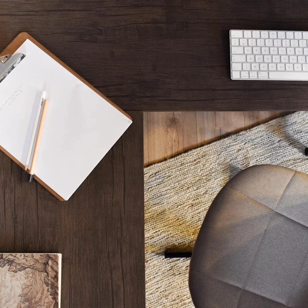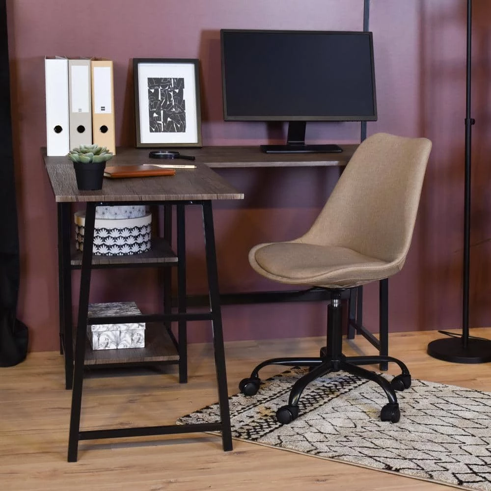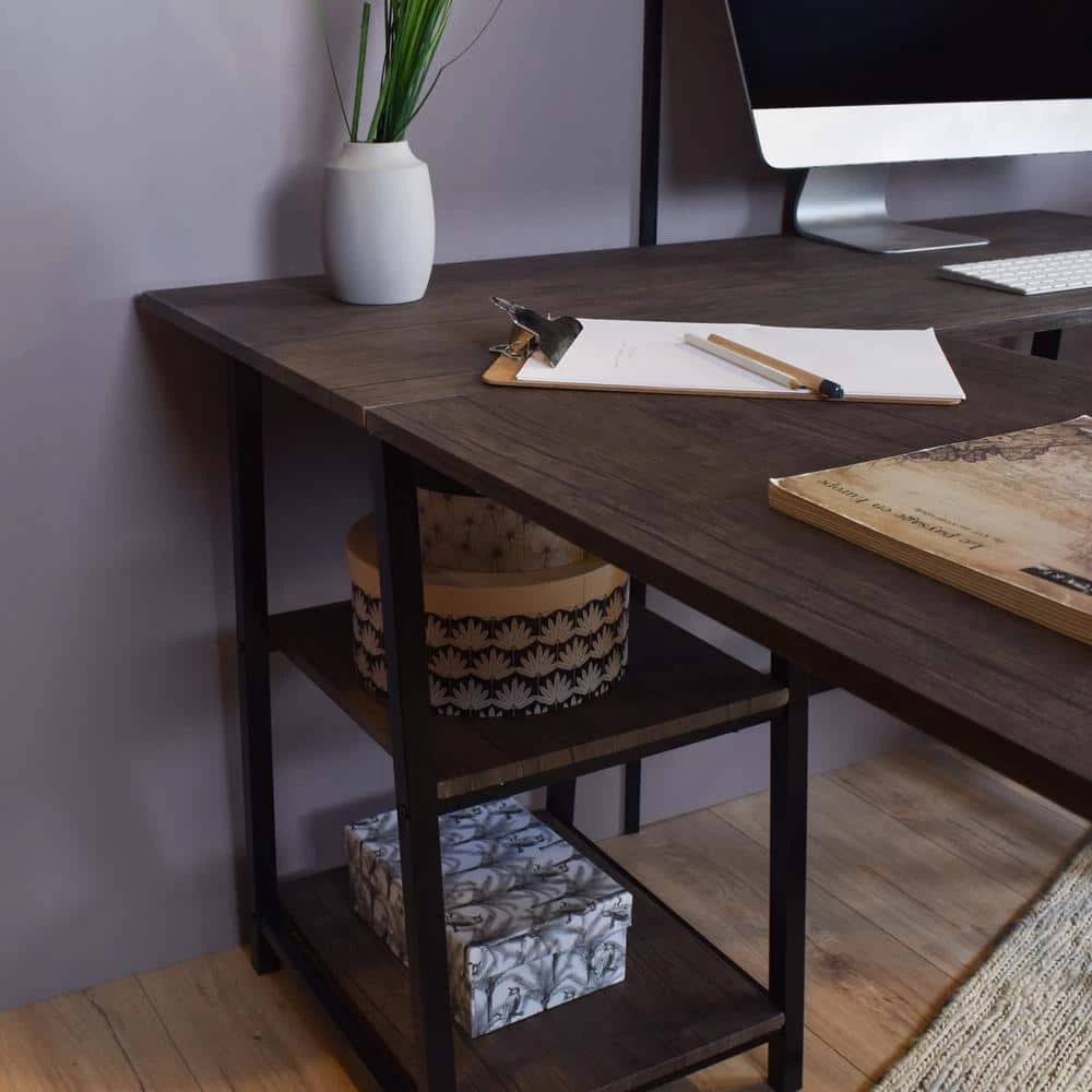 Give your work-from-home routine an efficient upgrade with this clean-lined executive desk. Its desktop is made from engineered wood with a natural finish, and its black metal base adds a mixed-material look to this piece. Its L-shaped design is a great way to outfit a corner in your home office, and its large workspace is ideal for accommodating a laptop, monitor, and desk lamp. Plus, this executive desk includes two open shelves underneath that are just right for storing away papers, office supplies, and files.