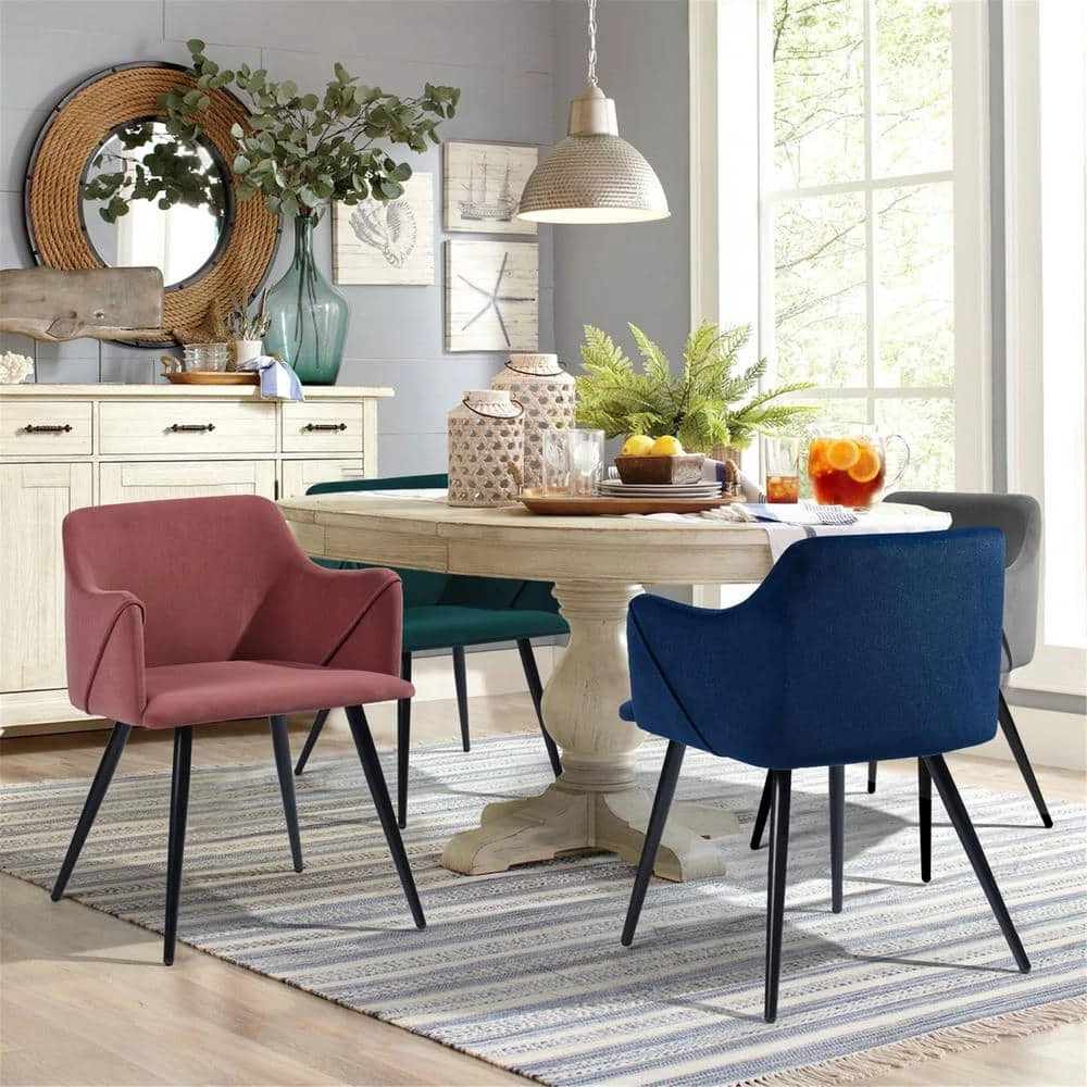 This set of two armchairs adds extra party seating and brings glam to your dining room table. Each piece has an engineered wood frame that rests on flared, tapered dowel legs made from metal in black finish for a mid-century modern feel. It’s fully wrapped in polyester blend upholstery for a textured touch, and it has a foam fill for a more cushioned seat. Its curved silhouette, recessed arms, and decorative piping round out this distinctive set. Partial assembly is required: Just attach the legs and you’re good to go.