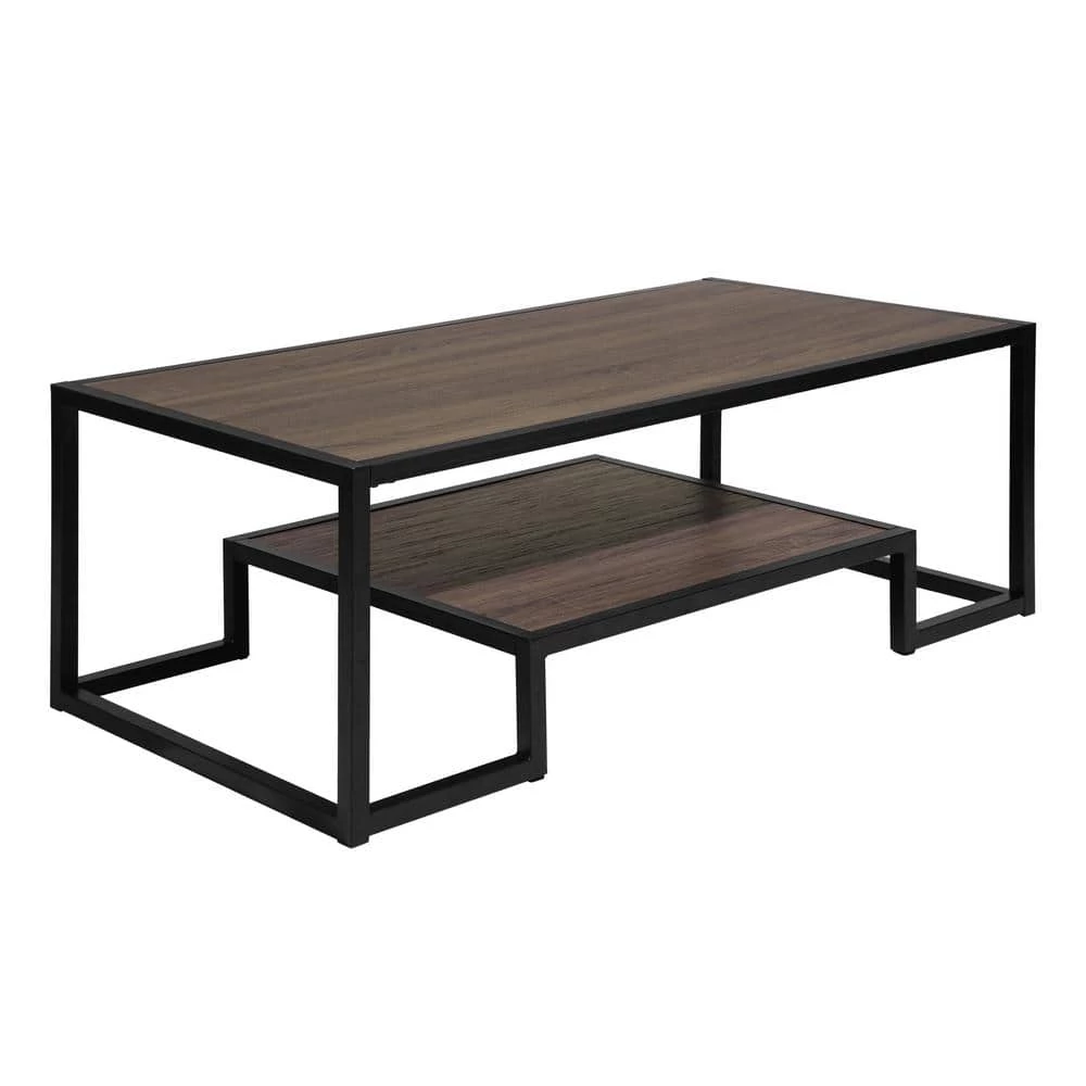 This handsome coffee table is crafted from manufactured wood and an iron frame with rivet detailing, giving it mixed-media appeal and a rustic touch. It showcases an open frame, allowing you to place decorative books or objects on its lower shelf, and your favorite hors d’oeuvres and cocktails up top during a dinner party or movie night.