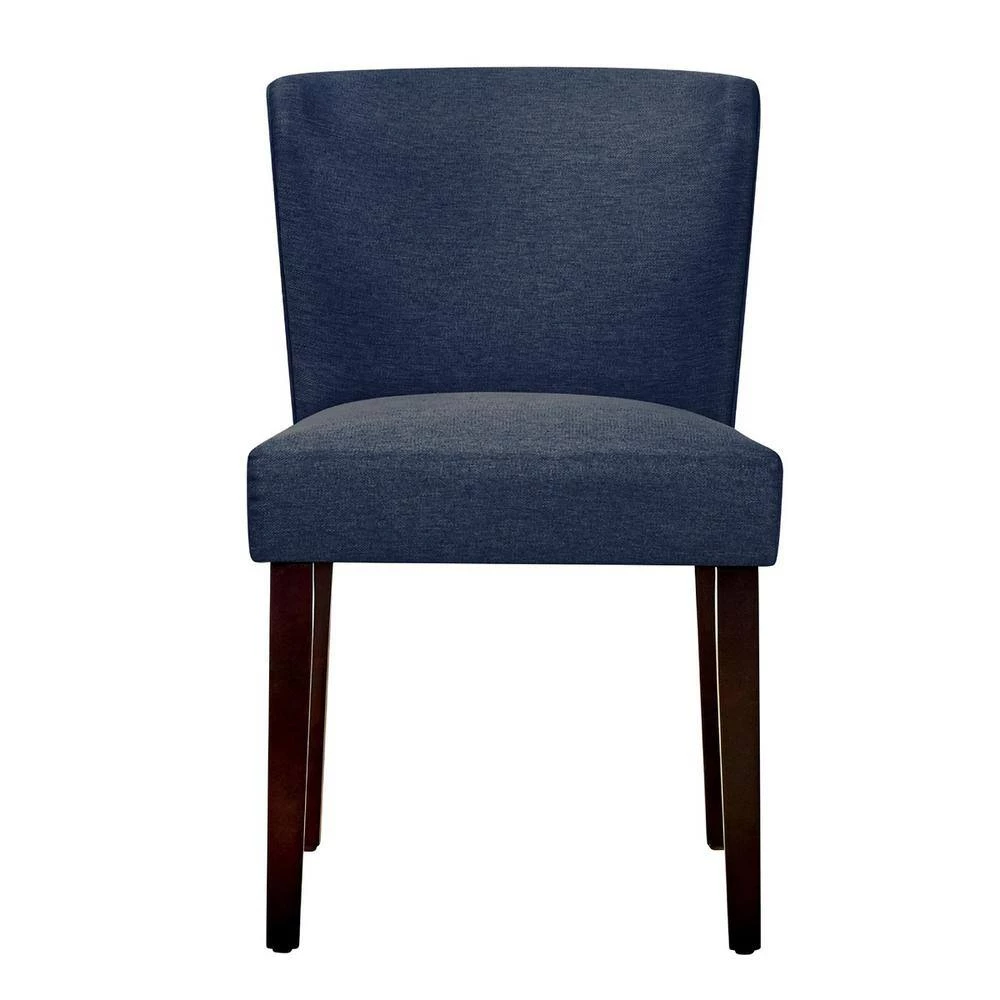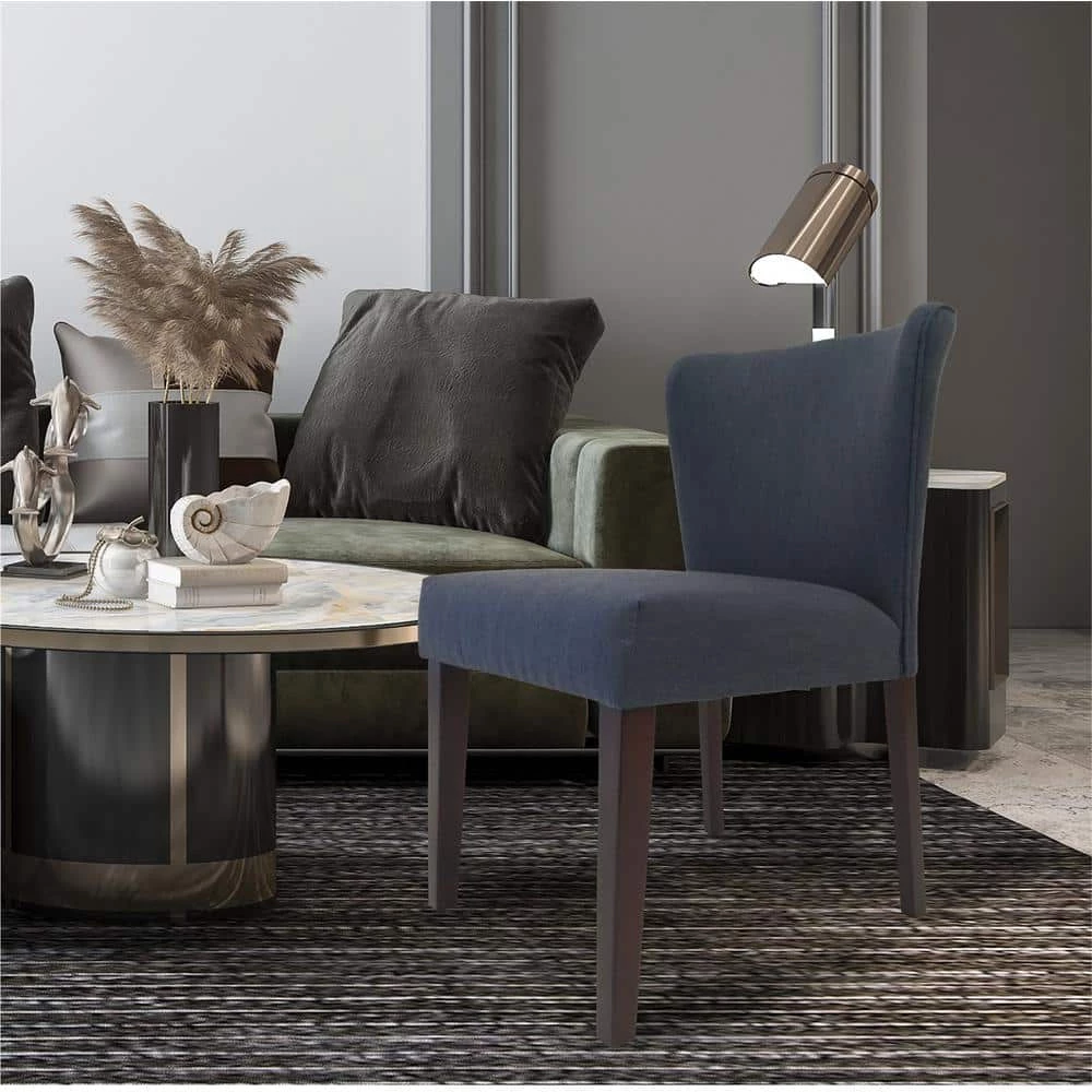 The Cambodia collection dining chairs feature contemporary and elegantly upholstered dining chairs. These dining chairs arrive as a set of 2. A sturdy premium rubber wood frame and a generous back provides each dining chair with unwavering structural support and endurance. The low-key navy fabric upholstery fits well to any dining setting. The dining chairs feature the beauty of a classic wing back design, an ample comfort seat filled with plush, high quality foam.