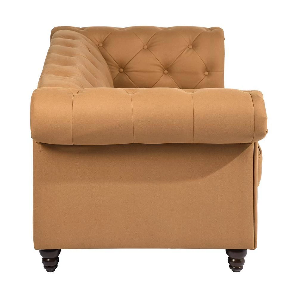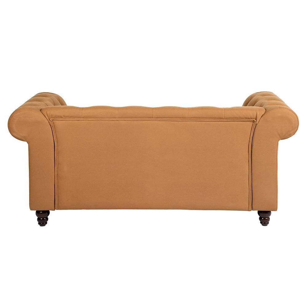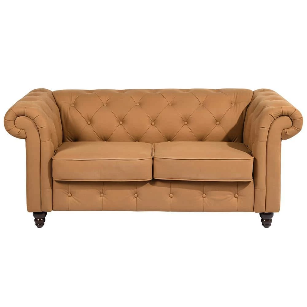 Update your space in elegant comfort with the EDWINA Fabric Sofa. The sofa design features a luxurious, deeply button-tufted back neatly framed by classic rolled arms. The arms are lightly pleated for an added dose of flair. 2-loose seat cushions are filled with memory foam for a plush seating surface that only becomes more comfortable over time. Turned, black walnut-finished wood legs round out the style.