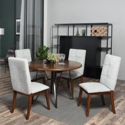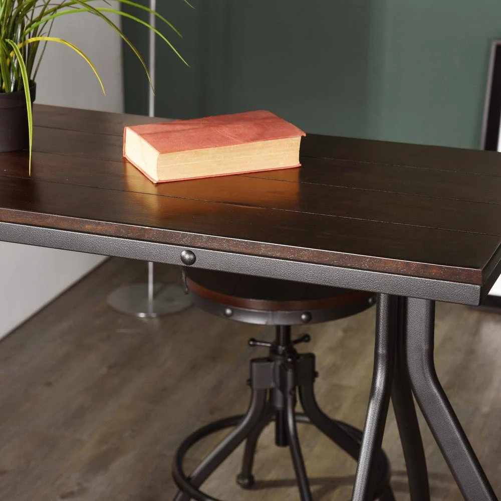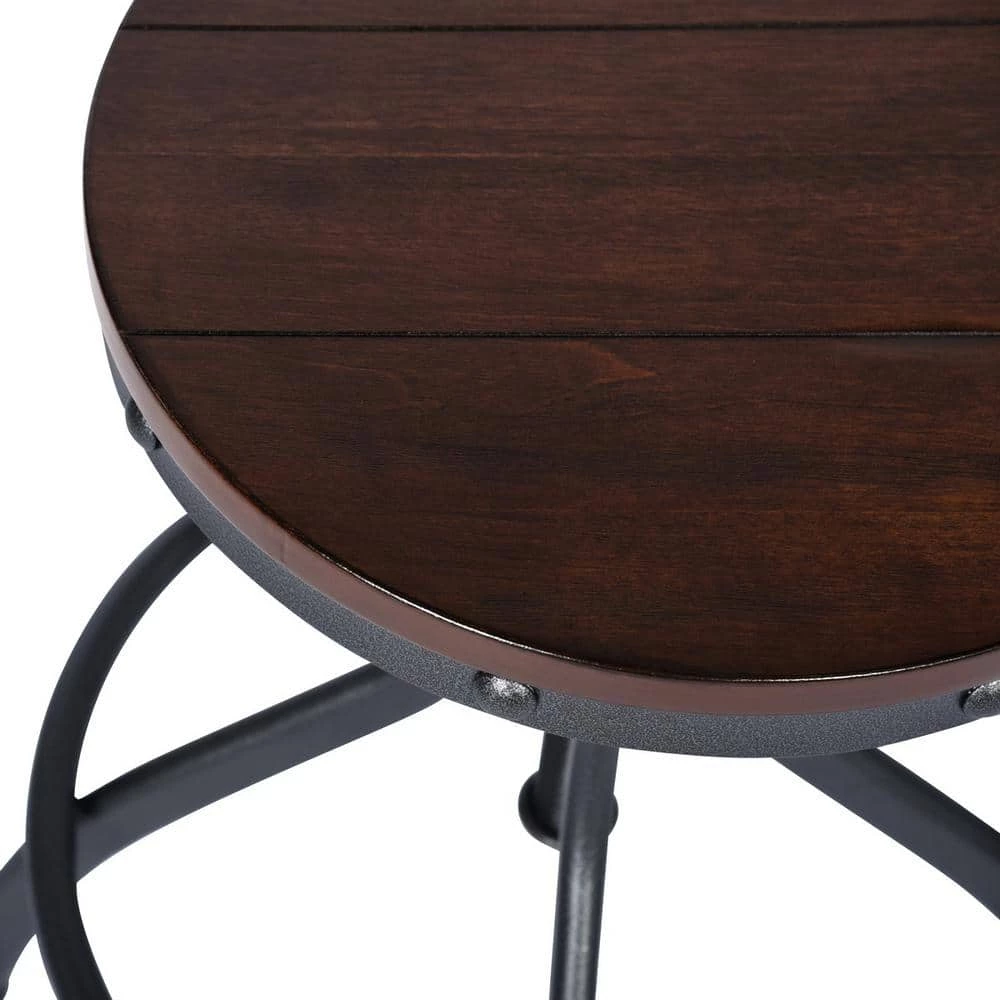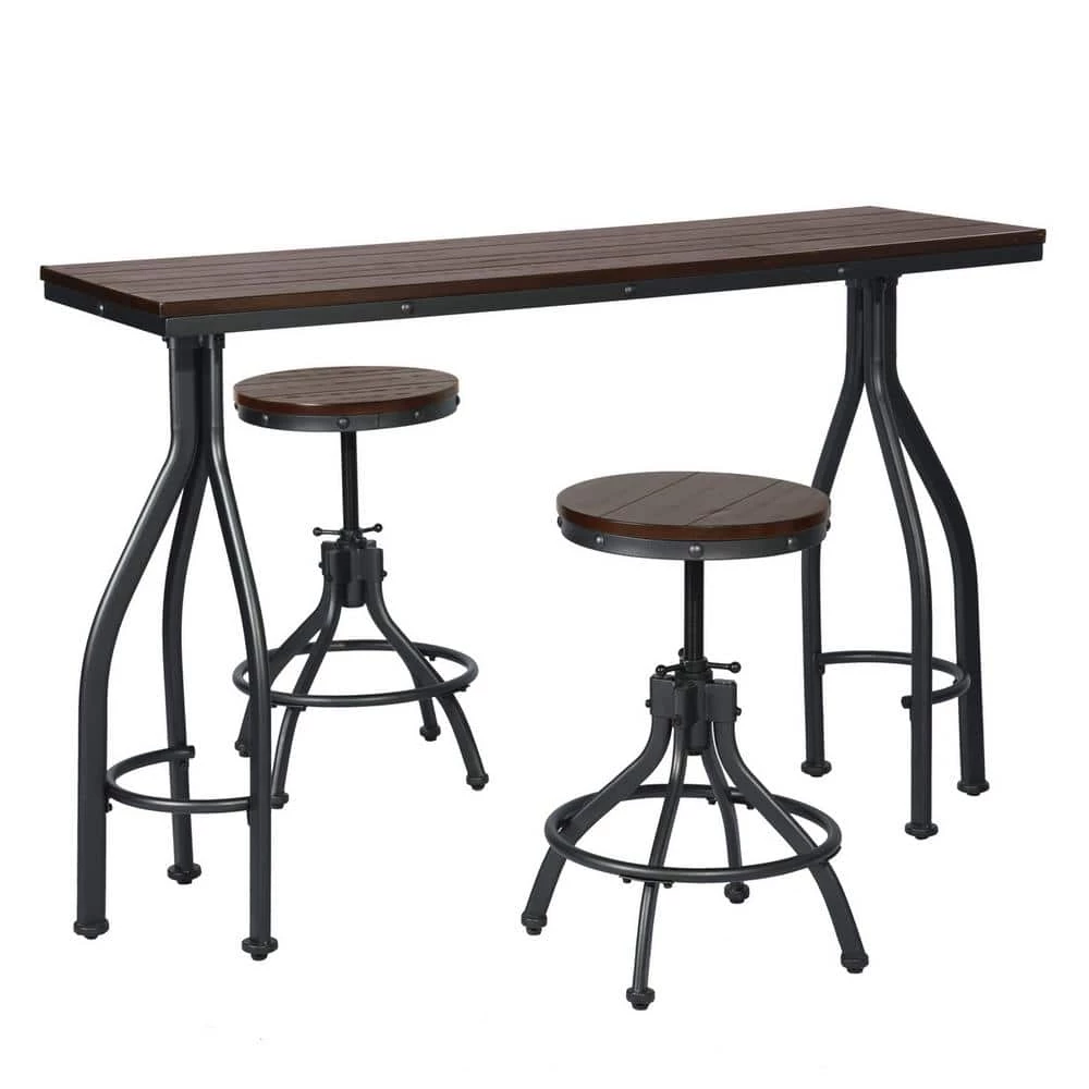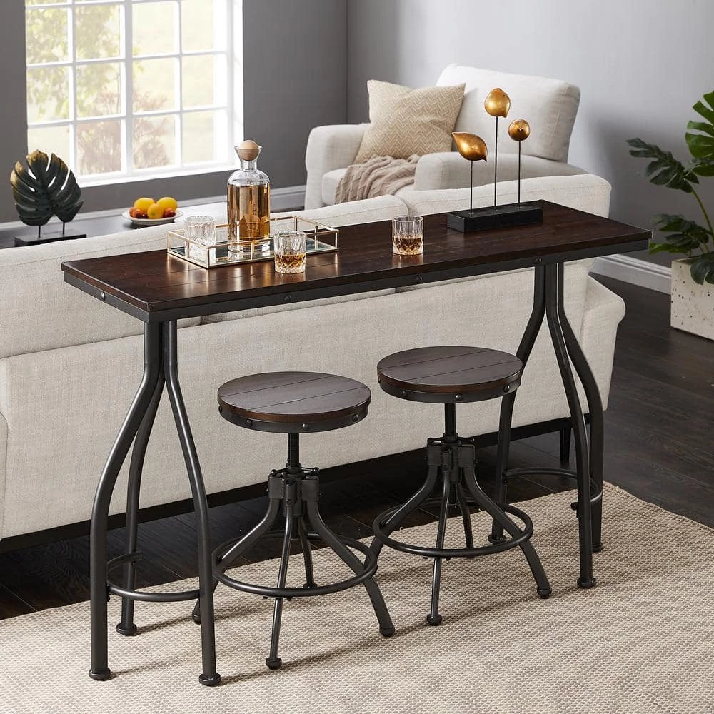 This 3-piece bar set combines modern and rustic styles for a standout addition to your dining room or bar area. It includes 2 stools and a rectangular table that has space beneath it to craftily slide the stools underneath when not in use. All pieces showcase stainless steel bases with curved legs for a sleek, streamlined look. Both the stools’ round seats and the tabletop are made from solid wood with a dark brown finish, and they feature a traditional panel design for a finishing touch.