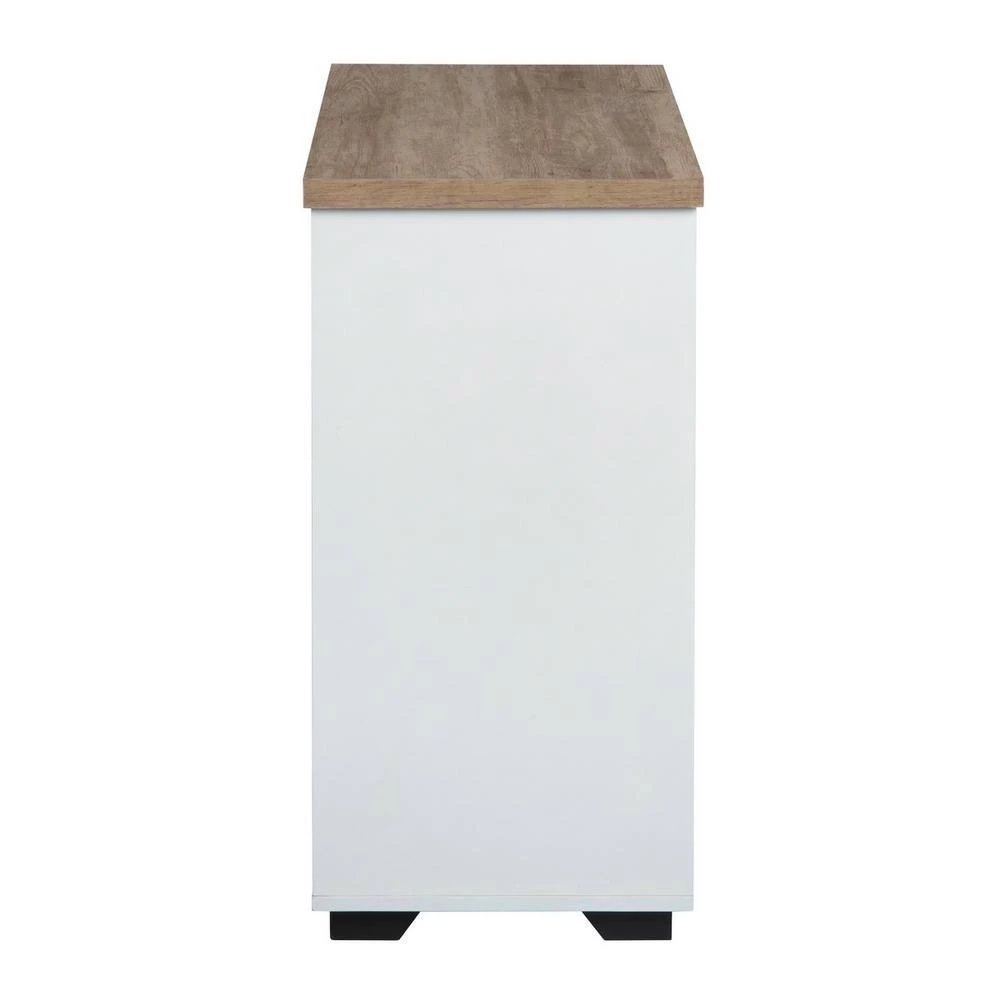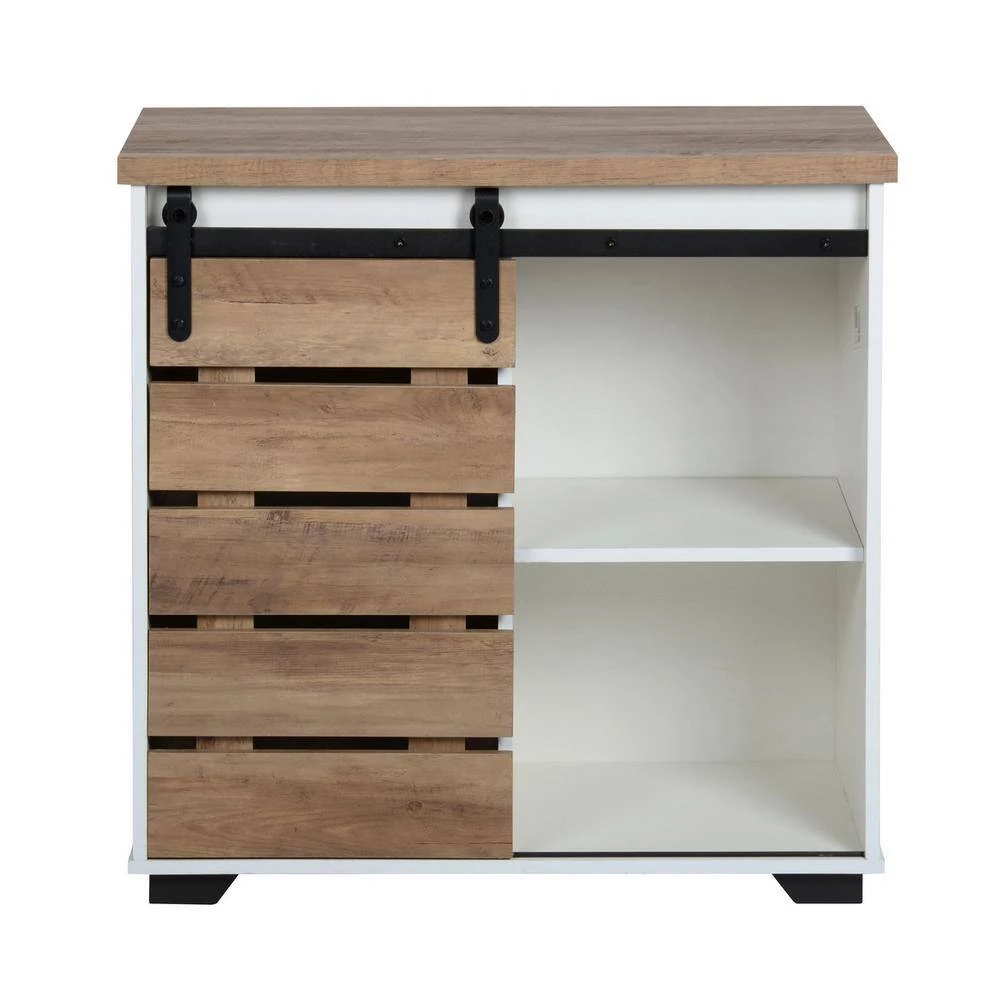 This sideboard showcases a streamlined design with two shelves that offer a stage to display a few decorative favorites. Two shelves rest behind the wooden sliding door, offering a spot to tuck away paperbacks and more. The combination of light wood and white is simple and chic, which lends an eye-catching focal point to your abode with a little help from our versatile storage cabinet.