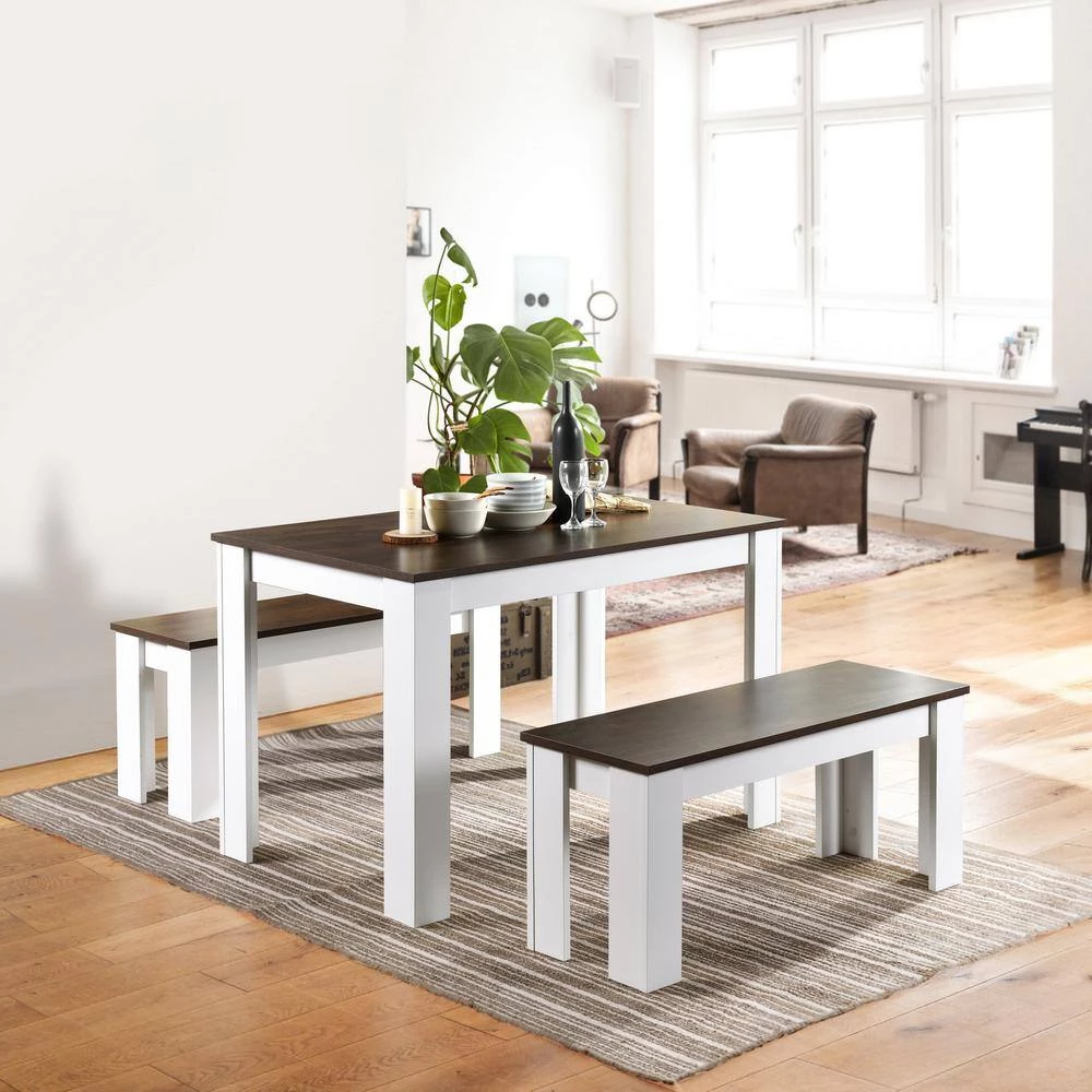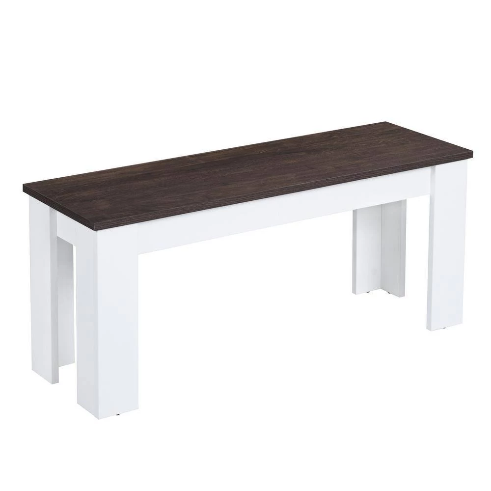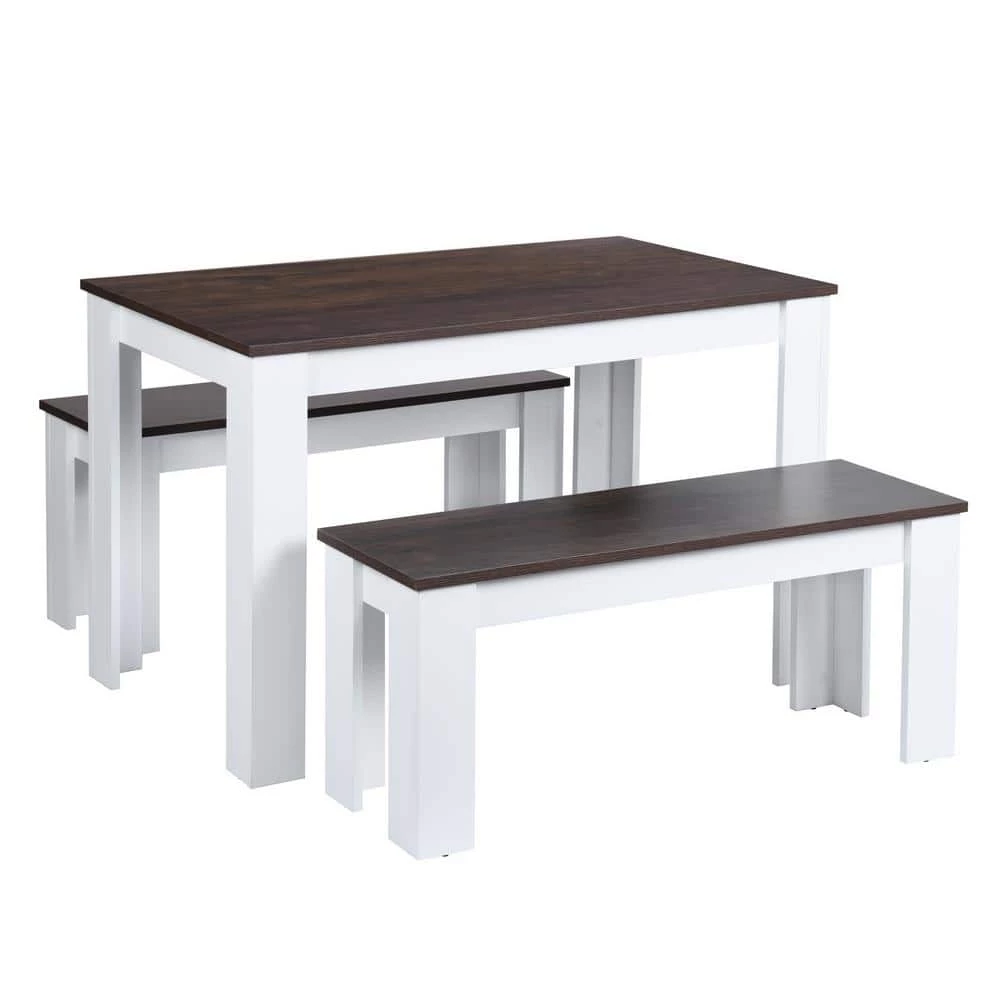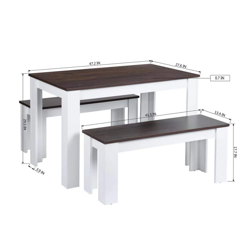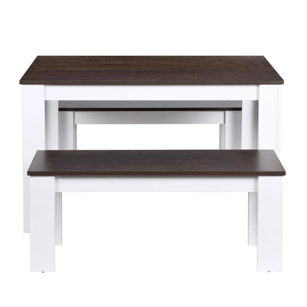Slide into style with the 3 Piece Dining Set with table and bench. Sturdy streamlined, straight legs set the tone for space-saving design. Crafted of durable manuefactured wood with an exotic wood grain effect-this dining table set creates a new standard for style and substance. The two-tone palette of white and brown or Oak naturally goes with the flow. Perfect for small space living and entertaining.