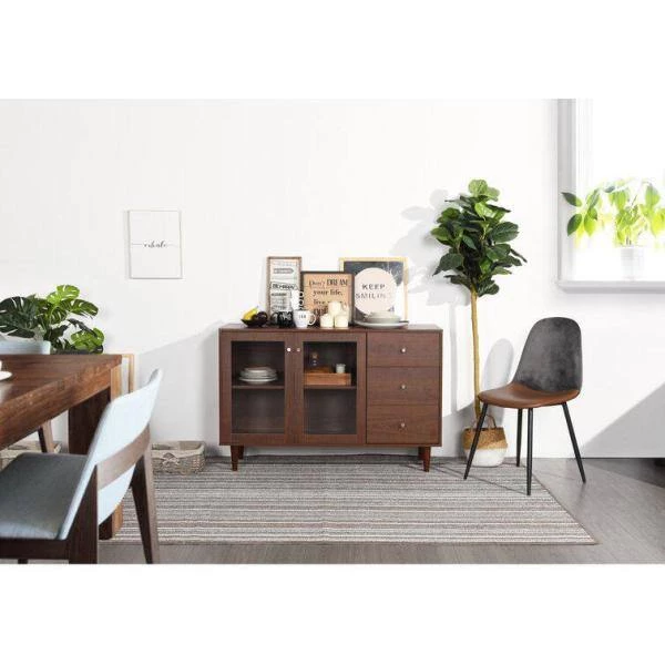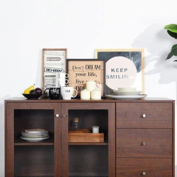 This sideboard has 3-soft-close drawers and double door cabinet to take organization to the next level. There’s room for all your favorite tablecloths, serveware, and holiday plates. And since this server measures almost 50 in. Wide, there’s room on the surface to lay out a spread for your dinner party. It’s made from engineered wood in a warm brown finish, and has a clean-lined design that looks good with any style, whether yours skews more coastal or farmhouse. We also love the paneled doors with visible glass.