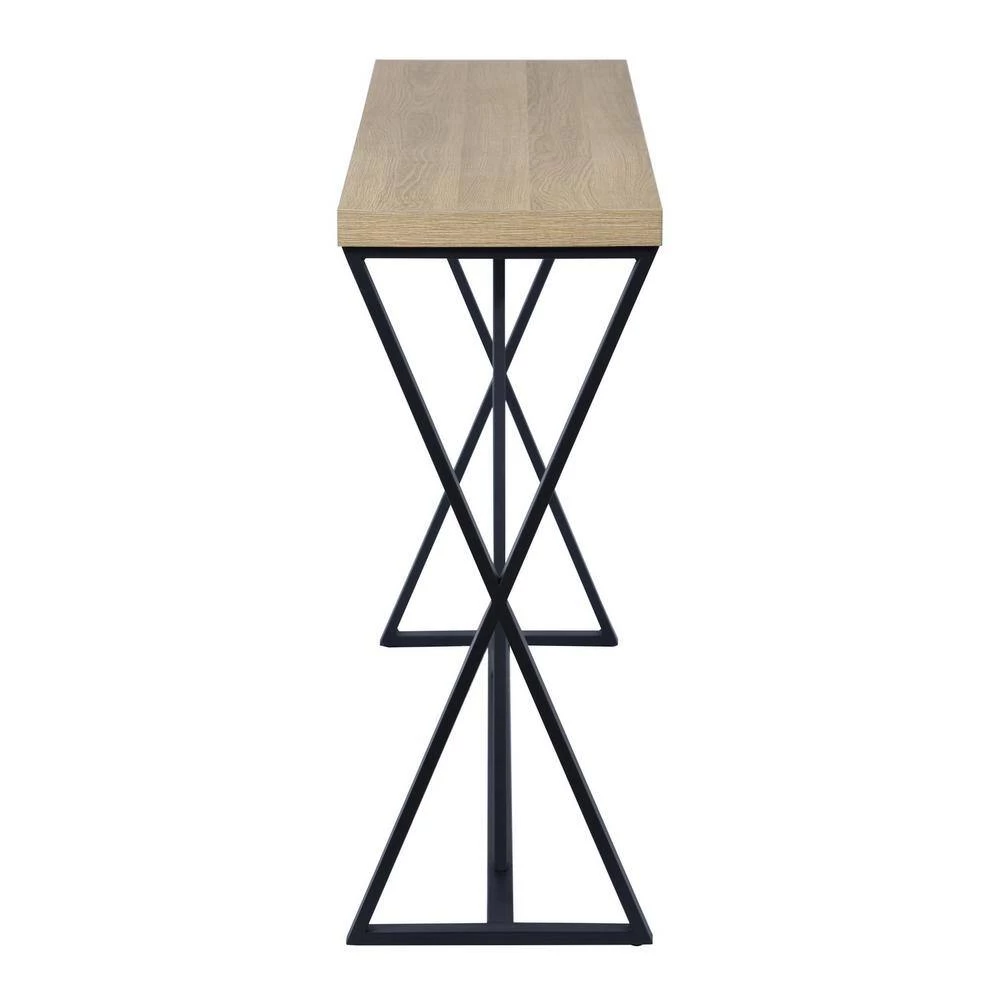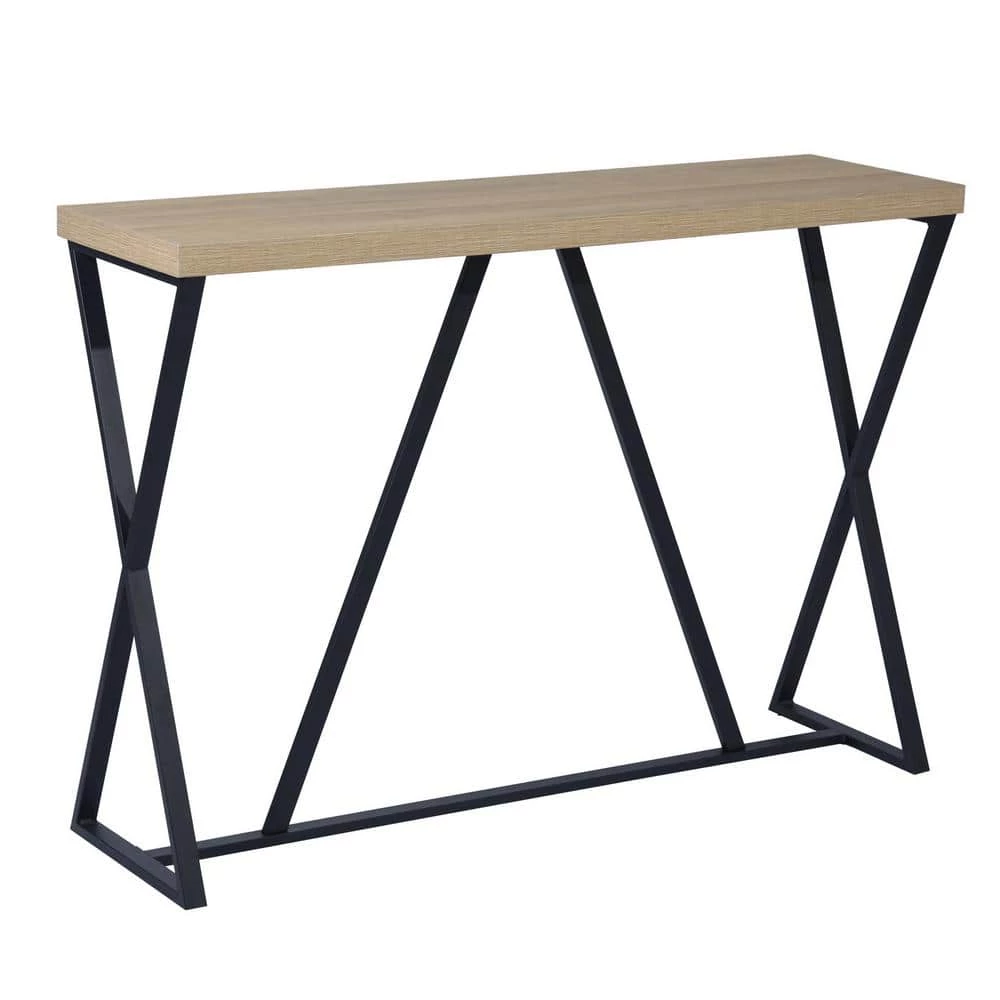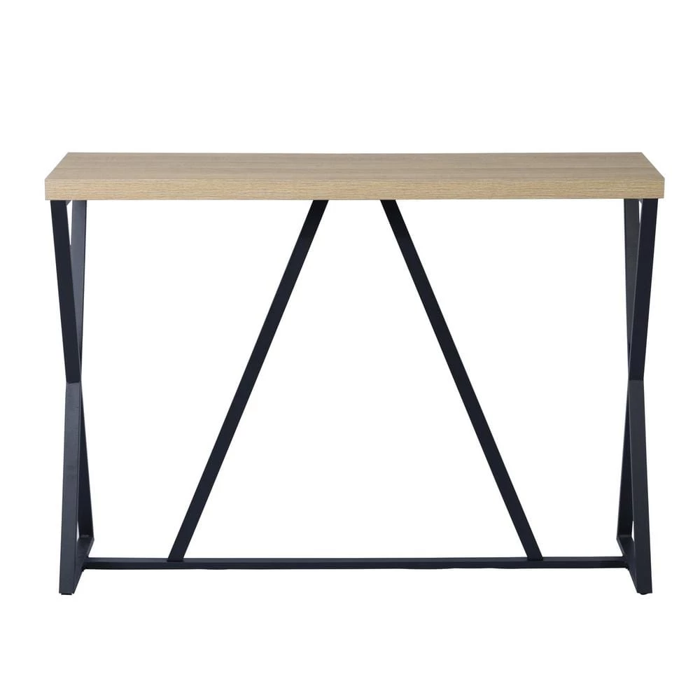 Capable of acting as a display space under a wall-mounted TV or a space-saving catch-all in the entryway, this console table is a versatile pick.Its base.is crafted from powder-coated iron, striking a geometric silhouette suited for modern spaces, while the beech wood colour top offers a mixed media look. The slim design of this piece makes it suited for narrow nooks and cramped corners.