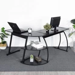 47.2 in. L-Shape Dark Brown Wood 2 Drawer Computer Desk with Open Storage Shelf by Homy Casa
