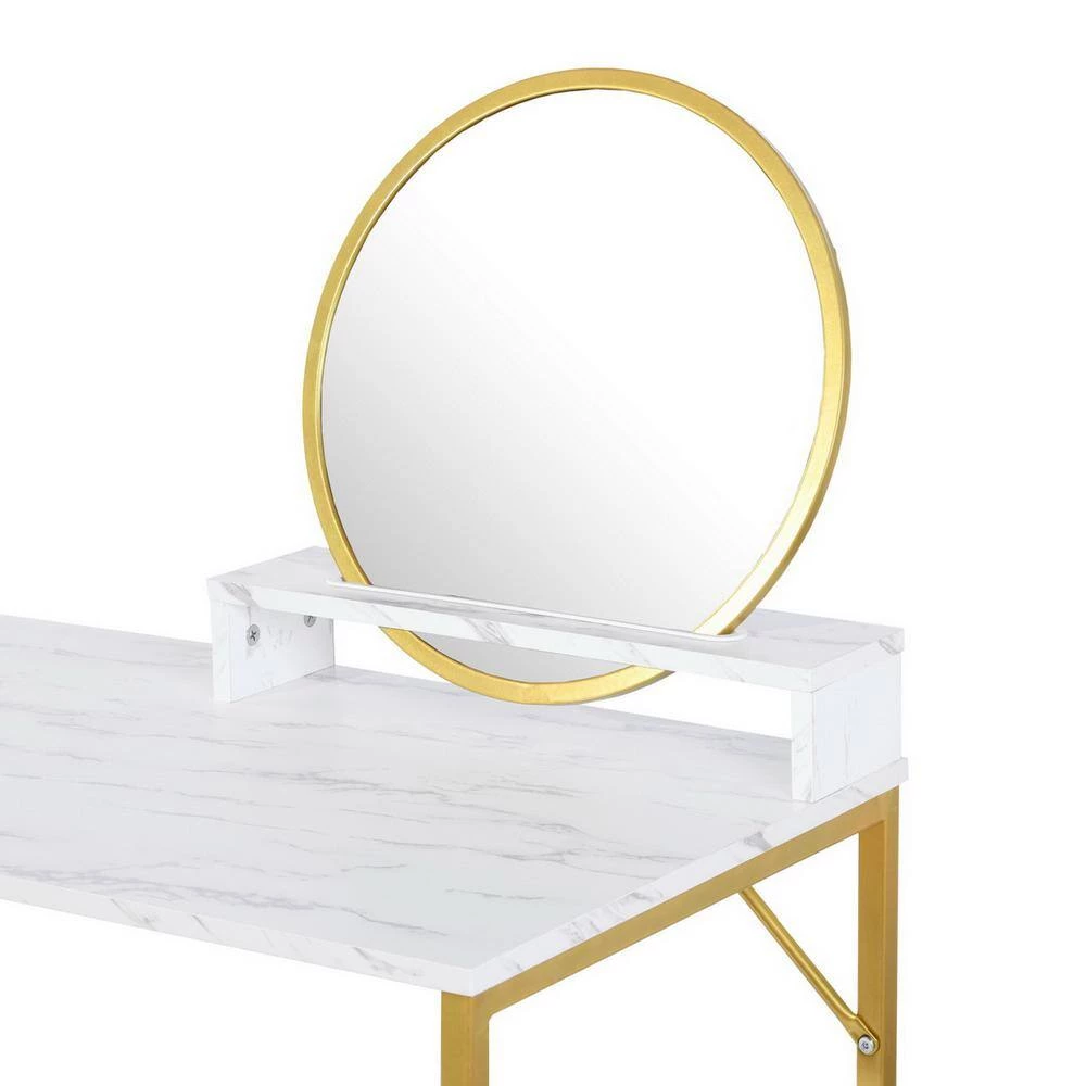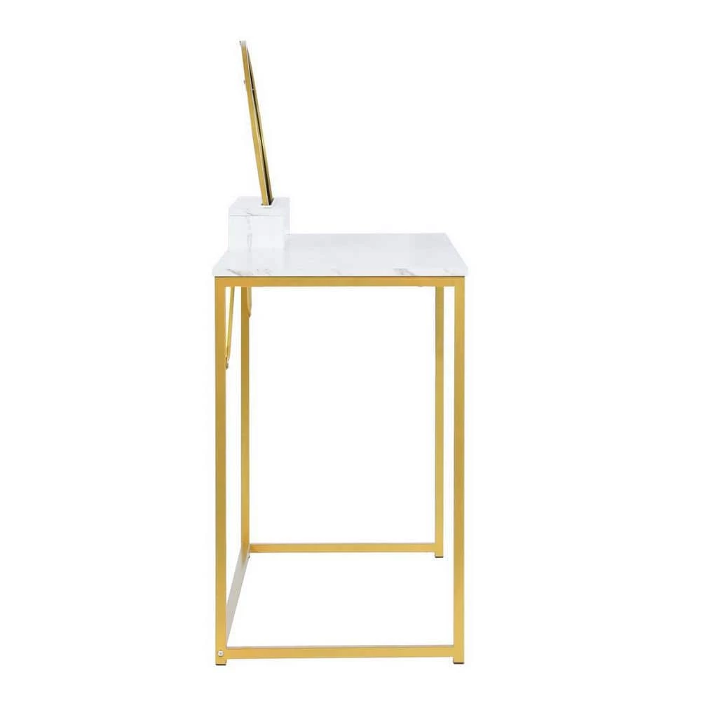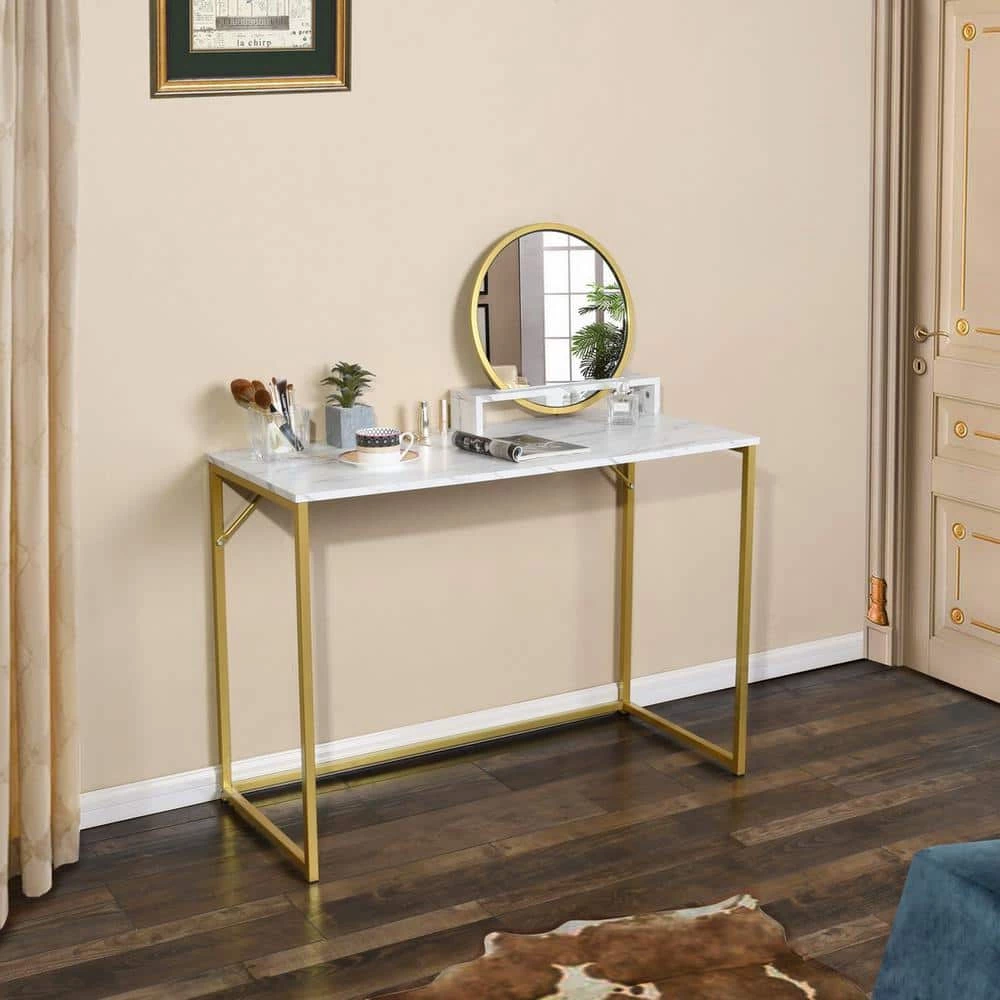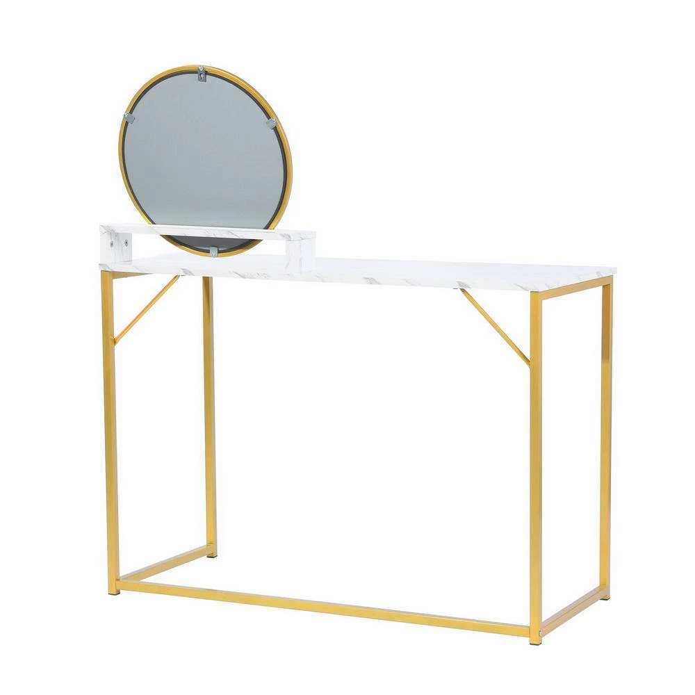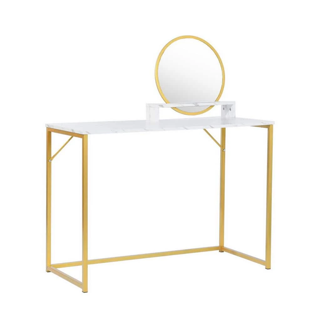 Sleek and sophisticated, this dressing table is a must-have unit for those who relish long mornings and quality nighttime. Mounted on golden finish legs, it has an air of sophistication surrounding it. Top with beautiful crystal vanity vessels and your favorite perfumes to complete the luxury look of the piece. A removable mirror sits in the slot or you can hang it on the wall. It can be used as a vanity, writing table, console table, or any other place you need.