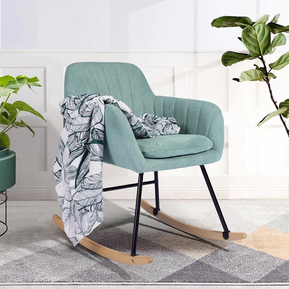 This modern rocking chair is as stylish as it is comfortable. Supported by a black steel frame on 100% solid wood gliders. it features arm and nice upholstery for superior comfort during long hours spent rocking, reading or relaxing.