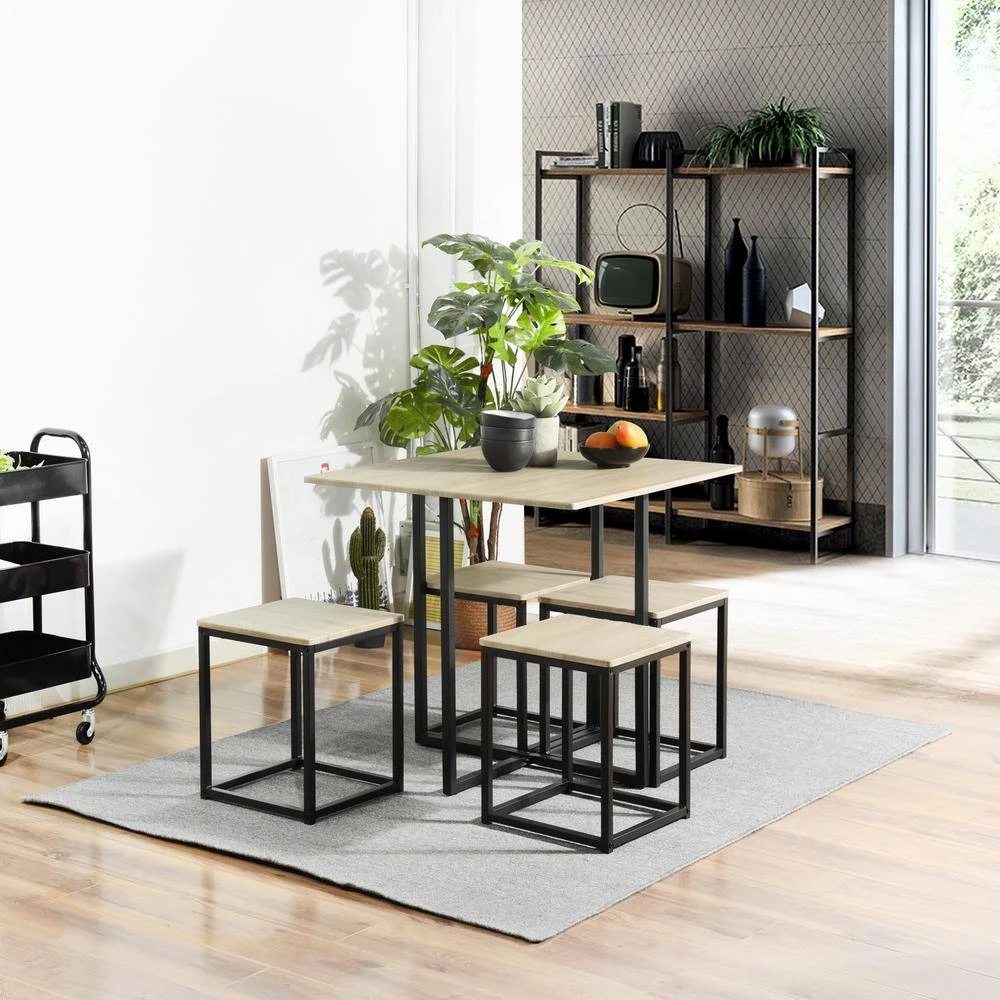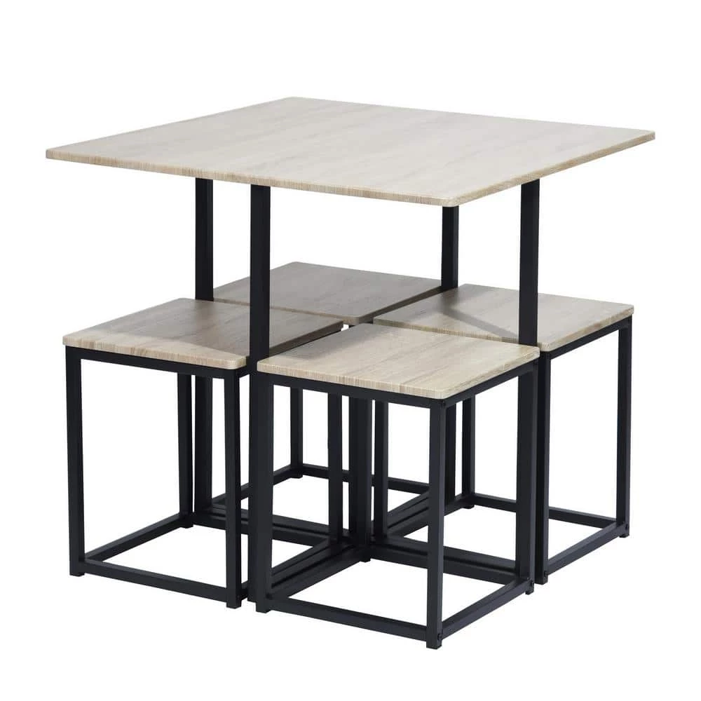 With a crisp, simple design and a compact footprint, this dining set is a fabulous addition to any kitchen. The stools all fit under the table for optimum space utilization.The charming look is wonderfully modern for a touch of flair.