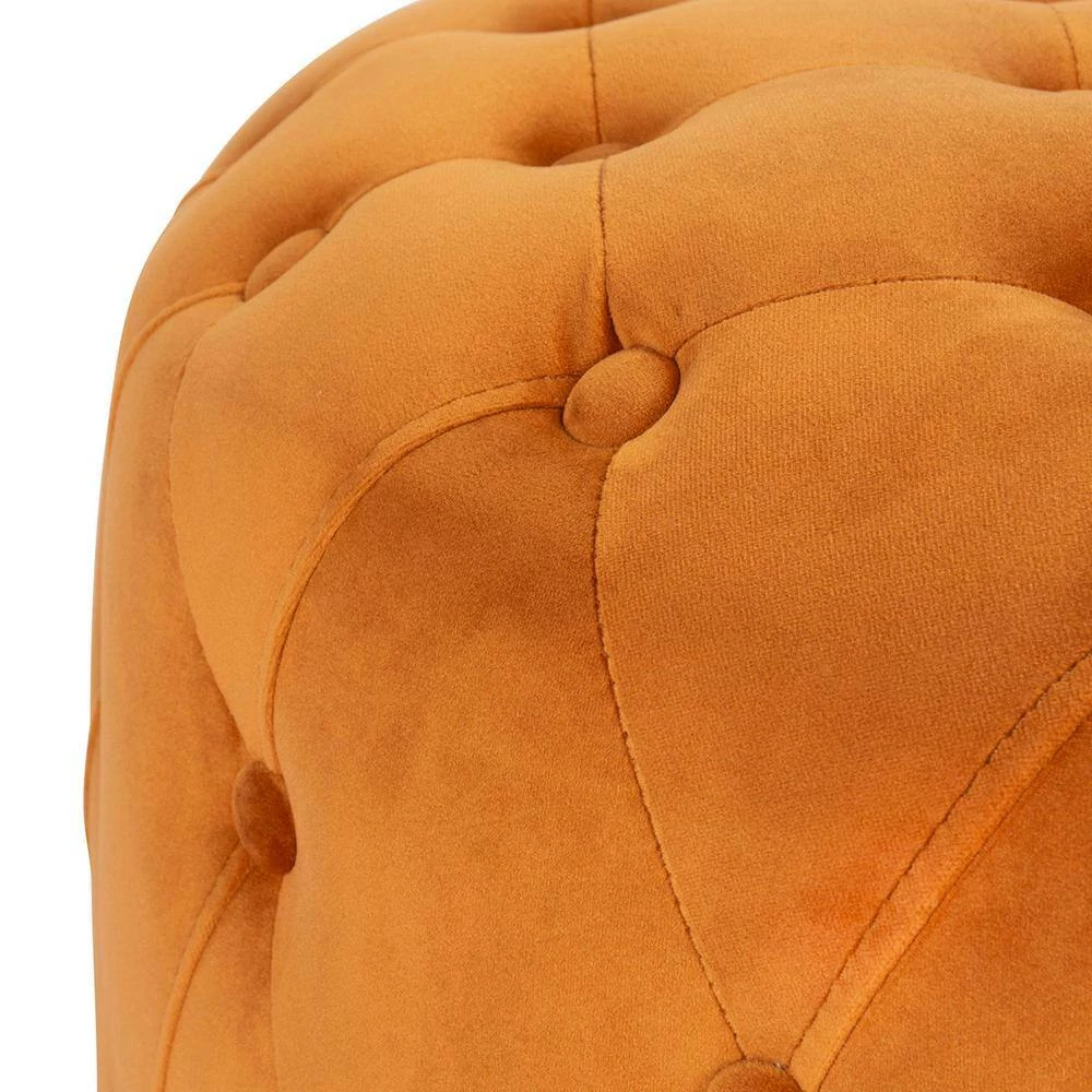 Enhance your living room seating arrangement with this orrange tufted round velvet ottoman. Position the ottoman next to your sofa, loveseat or chair to use as a soft, stable footstool. Offer the ottoman to a guest for a cozy, comfortable seat while watching a movie or visiting with your friends and family members. The tufted button design of the ottoman injects the piece with a touch of elegance, which you can use to put the finishing touch on your living room or bedroom decor. The orange upholstery color and soft velvet fabric are ideal for semi-formal to formal rooms in your home.