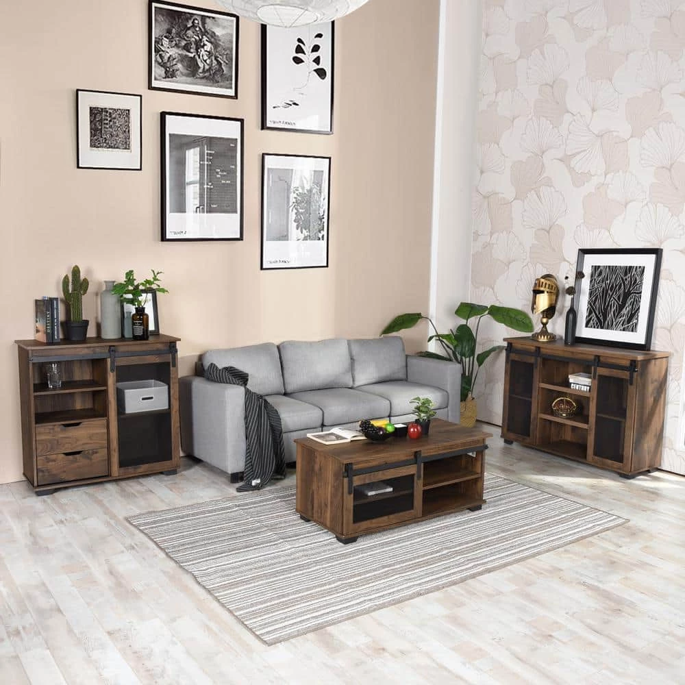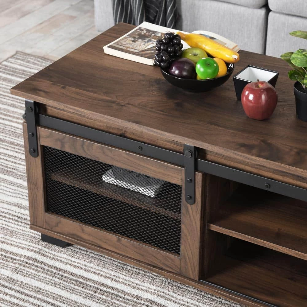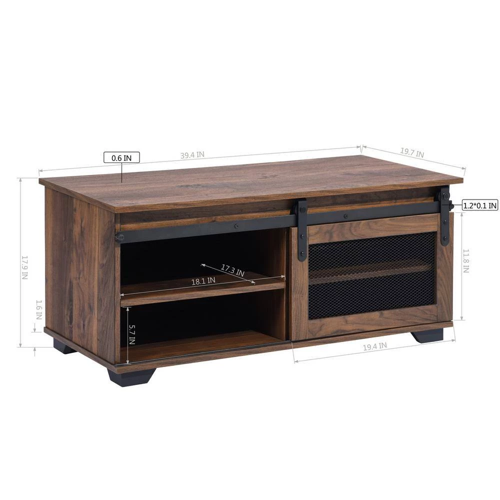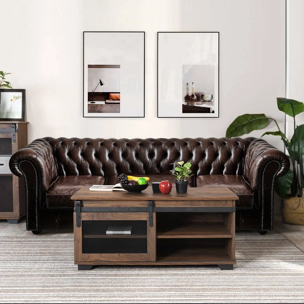 Cool, understated and generous, this industrial coffee table has got form and function covered. With its practical shelf storge and sliding door, this table makes an welcome addition to living space. It combines a black-finished frame with a weathered walnut top.The piece channels cool, chic vibes thanks to its clean-lined silhouette.