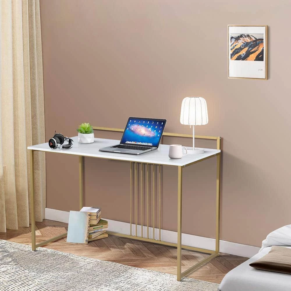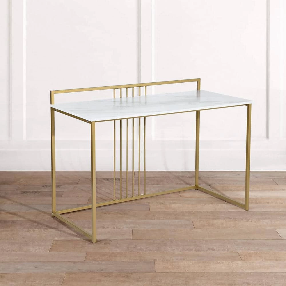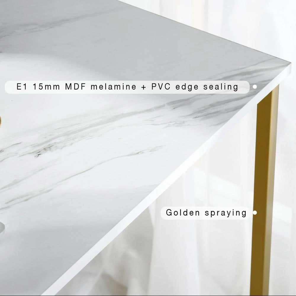 With a flattering, faux marble table top this computer desk will give your home office or bedroom a glam and modern style. The table top made of laminate features a UV coating which gives it a high gloss shine making it look like polished marble for a sophisticated touch to your home with its sleek metal legs. Use as a writing desk, work desk, or computer desk to finish your work, catch up on homework, write a paper, or use your laptop. This computer desk will update your living space with its contemporary fashion.