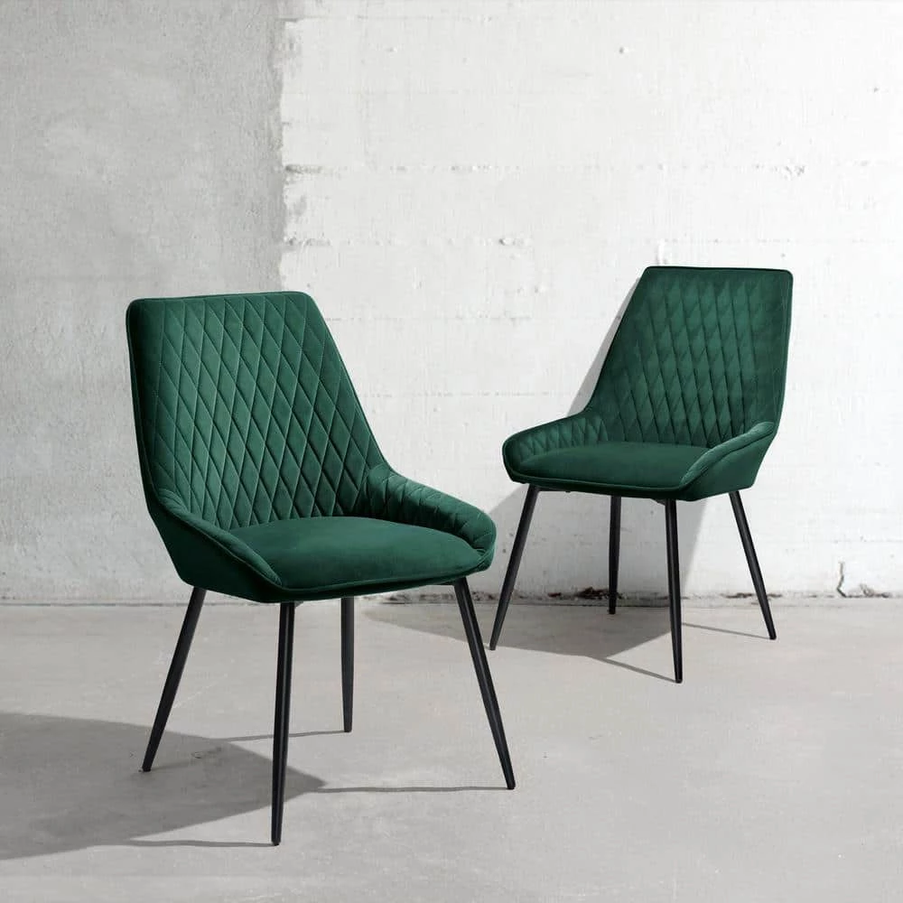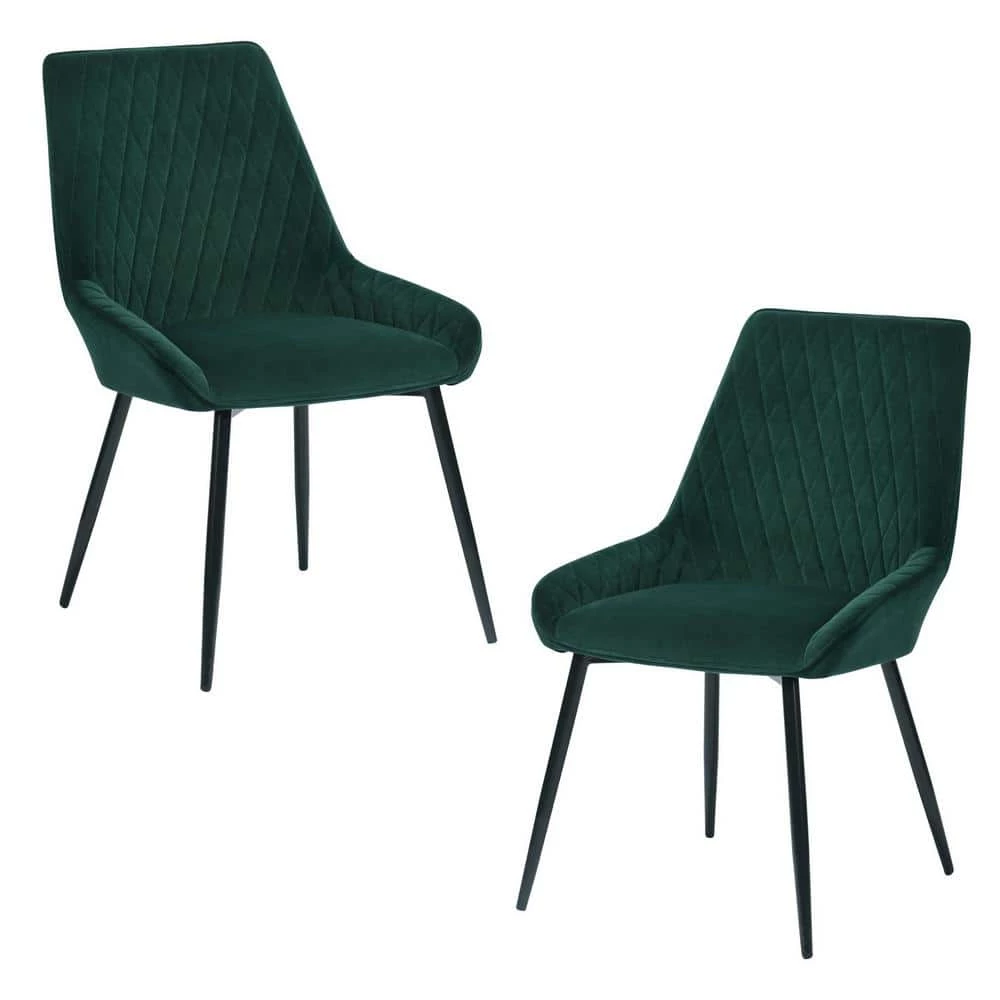 This set of two side chairs gives you just the right amount of modern style, with luxe elements great for both dining rooms and living spaces. Each piece features a solid and engineered wood frame with four sleek, angled metal legs in a sleek black hue. These accent chairs are wrapped in a polyester blend fabric, and they’re filled with foam for plenty of support. Heavily recessed arms and diamond tufting round out this glam look. Some assembly is required, with all tools included.