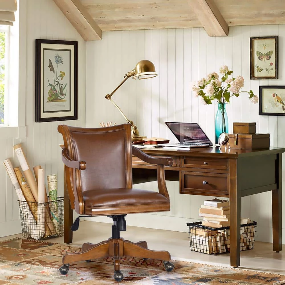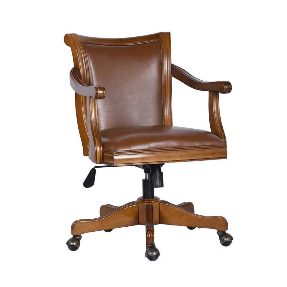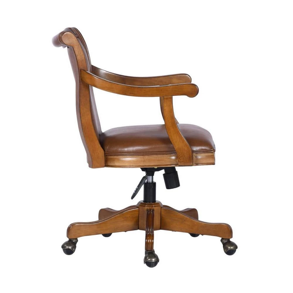 This swivel banker chair brings a taste of traditional character to your study. Founded atop a five-point base finished in rubber wood, this chair is crafted with a solid wood frame . Caster wheels below offer must-have mobility, unique Curved Backrest Design for Your Comfort.