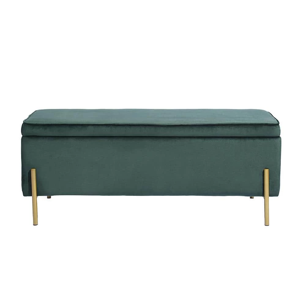 Add a little character to your living room with the Majestic Home Goods new Villa collection. Its frame is made of velvet and golden powder coating metal legs. This Ottoman is the perfect accessory to add comfort and style to any room while functioning as a bench, foot stool, or coffee table. Hidden storage helps to reduce mess and organizes toys, pillows, or magazines neatly. Stylish enough to grab glances in the living room, this ottoman seems to do it all.