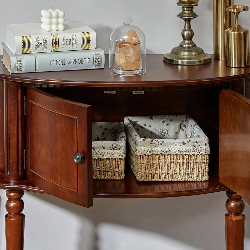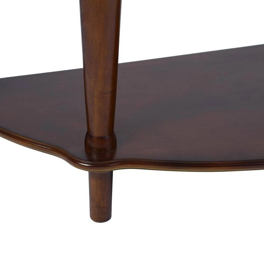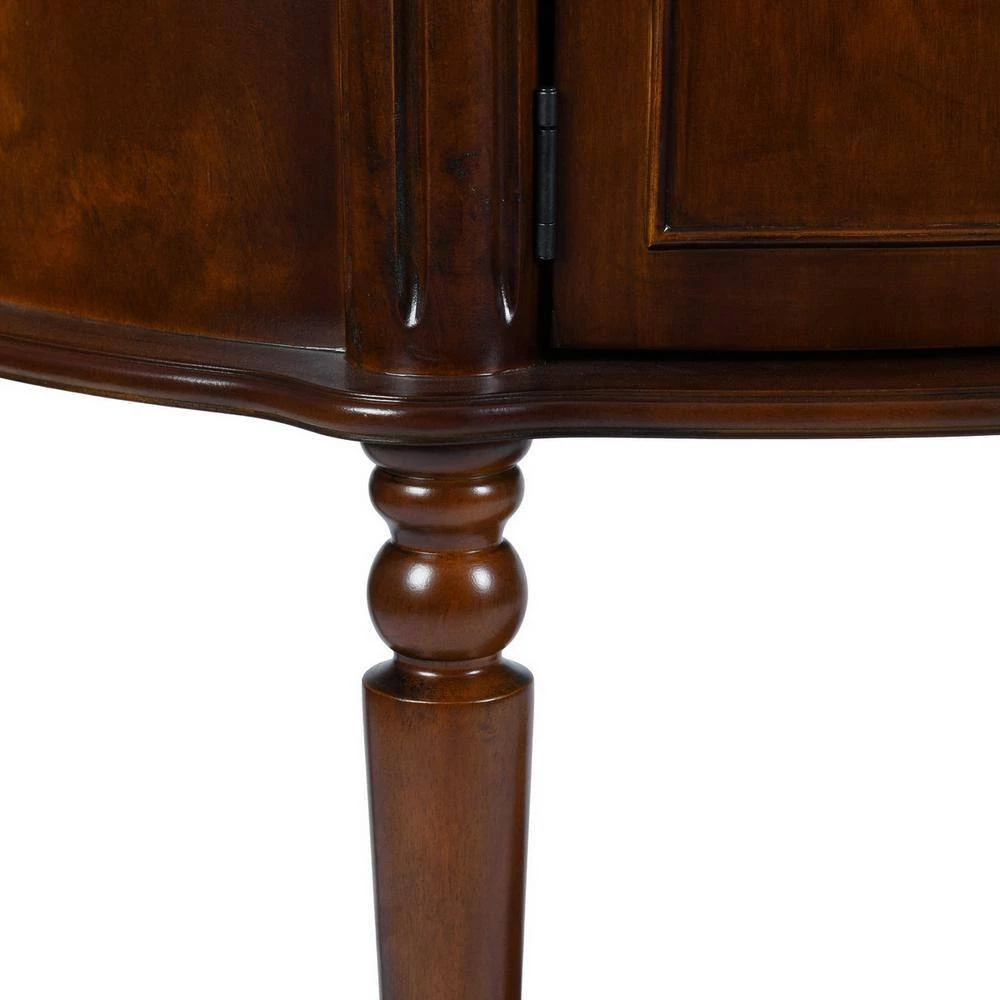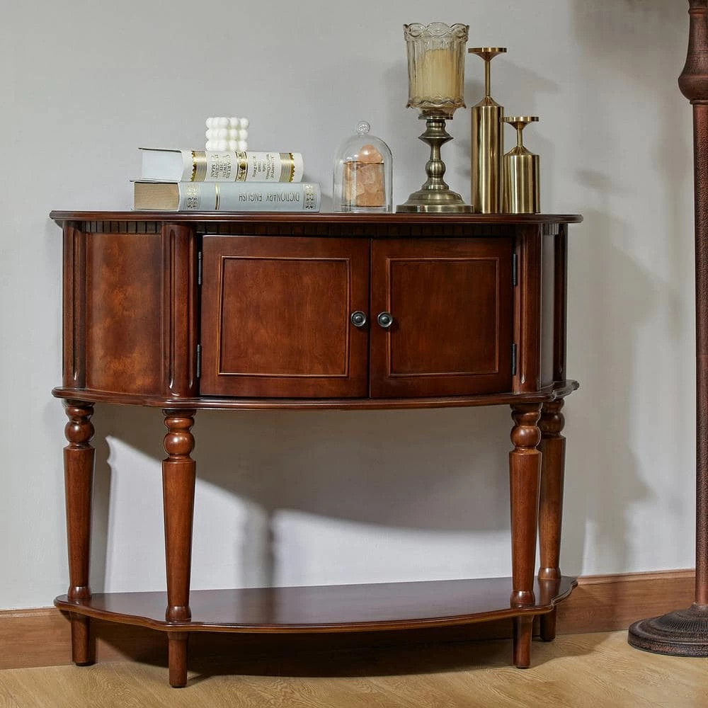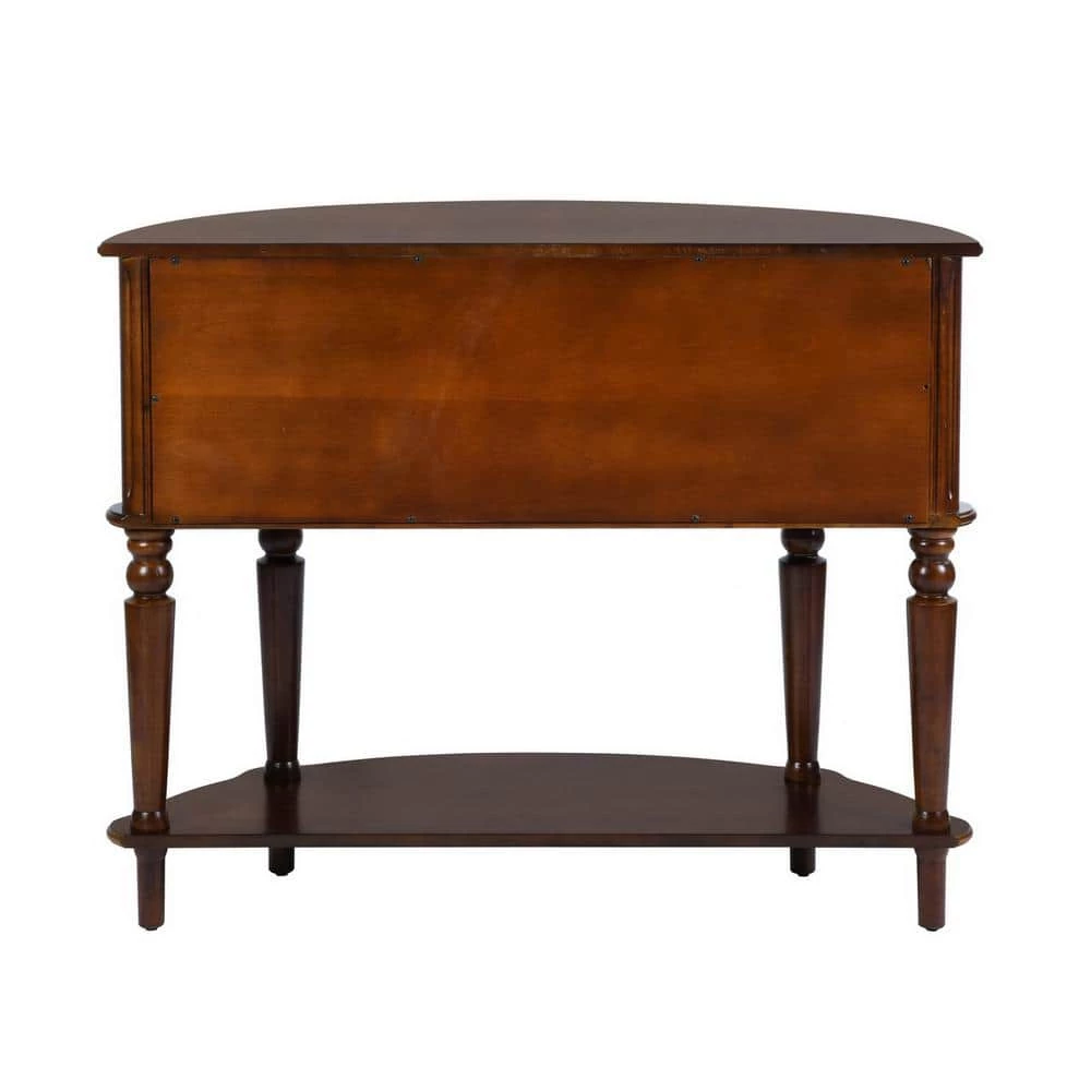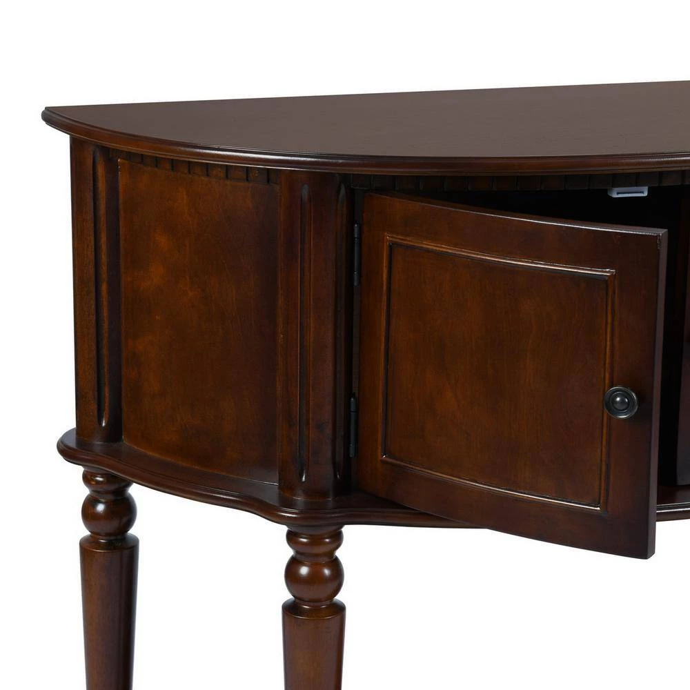 With a romantic half-moon shape, this demilune console table stands out and gets noticed. Transitional styling creates a beautiful piece with traditional accents and modern upgrades. The luscious cappuccino finish is both bold and enticing. The cabinet with two doors make room for stashing essentials, and a bottom shelf accommodates books and decor. Place this elegant console next to a seating group, or position it as a standalone piece in an entryway.