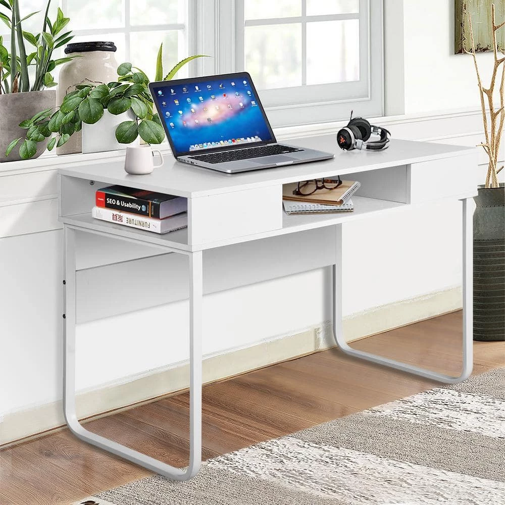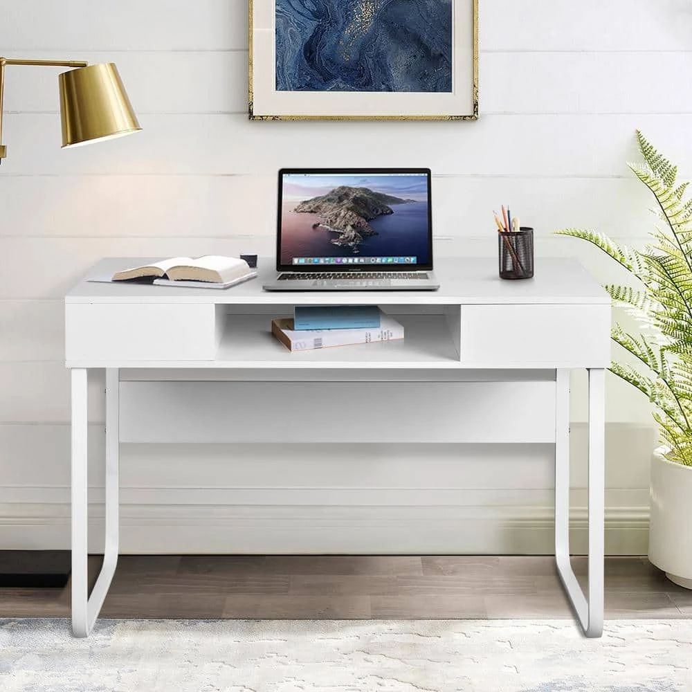 Clean, minimalist, and high-function design make this desk the perfect addition to any home office, bedroom, or living room, creating an ideal work surface as a computer desk, writing desk, vanity table. The wood white desktop (43″L x 21″D) provides plentiful space to keep a computer, laptop, and decor to personalize your home office or vanity space. There the slots on both sides for storage, as well as a bigger slot in the center for storing paper and ink for a printer.