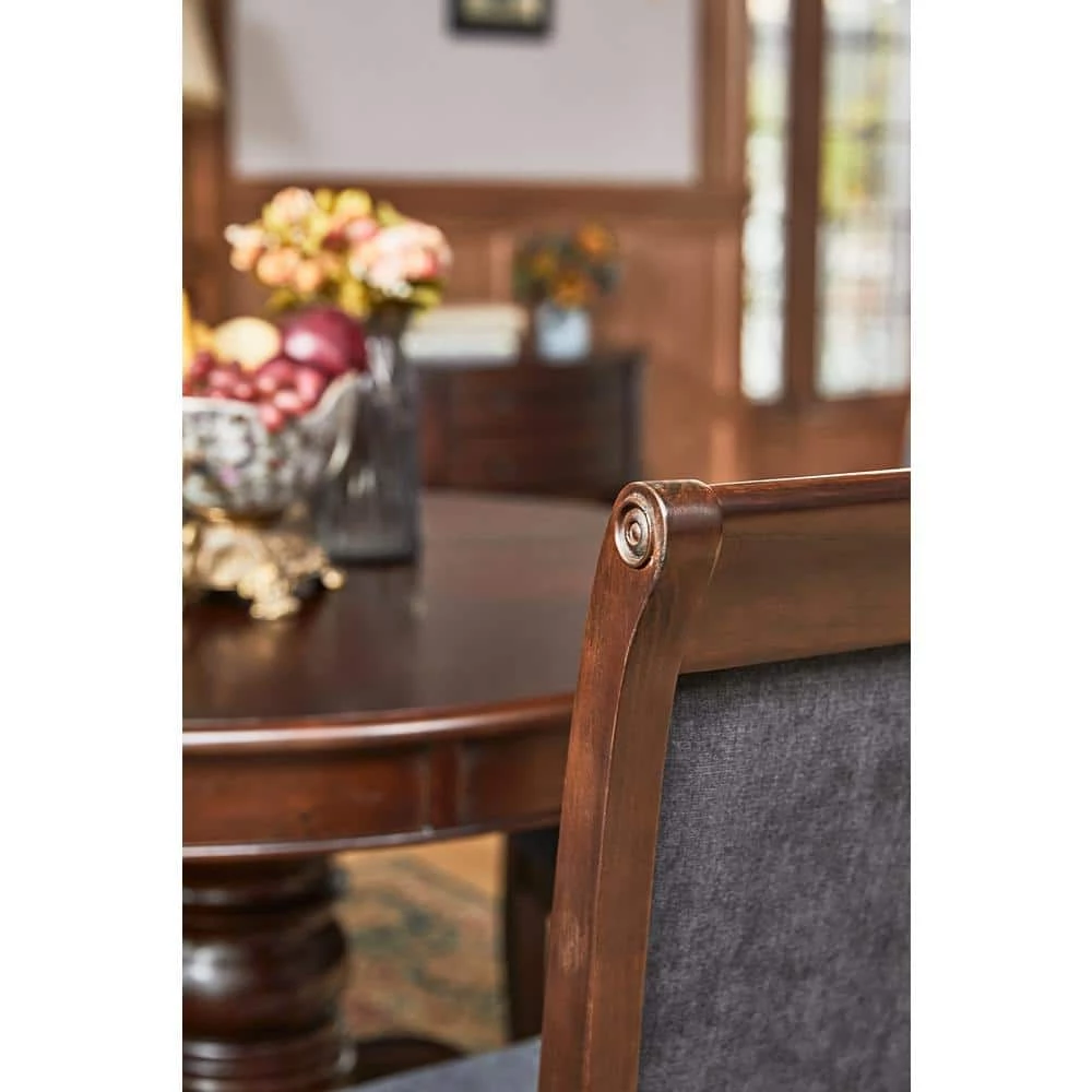 Discover boldness and brilliance with this magnificent formal dining table. Showcasing a refined round silhouette, this dining table features a pedestal table base and sturdy leg supports crafted from solid wood with veneer which is suitable for any dining room. Finished in brown cherry, this dining table and side chairs, which are optional and sold separately, complement each other well to produce a striking and transitional piece.
