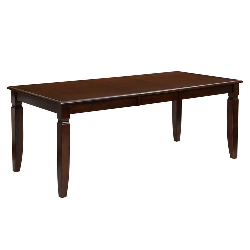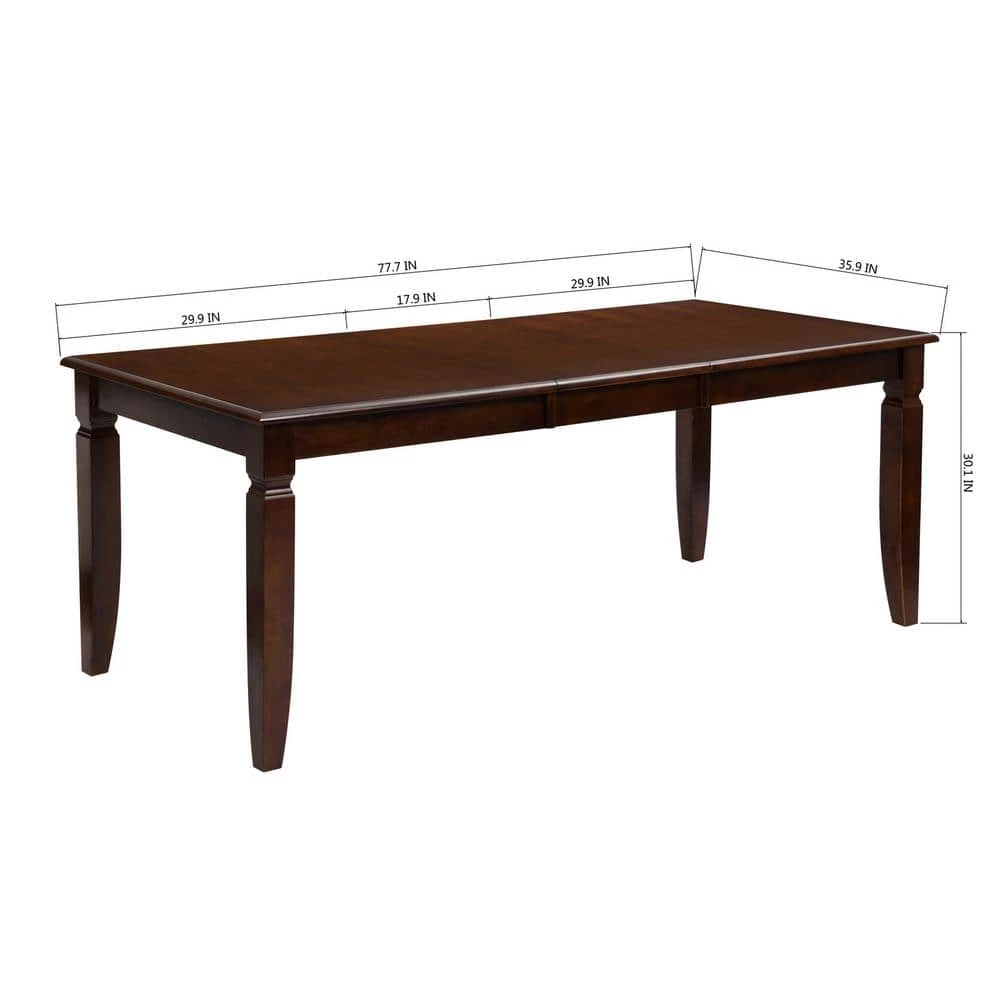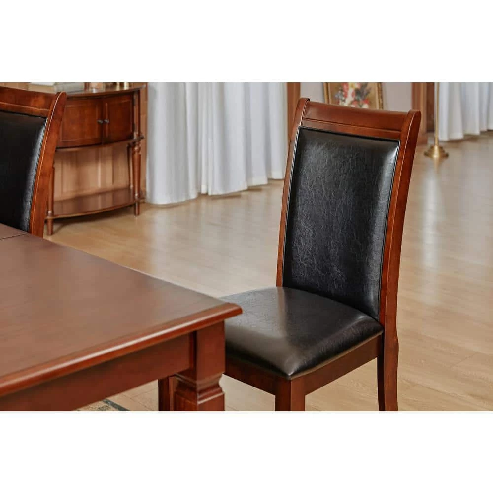 Richly brown with a versatile look, this transitional style inspired dining set is sure to enhance the beauty of any dining room decor. This complete dining set features a bold table with simple angles, ,padded leatherette chairs perfect for entertaining guests and family. The dining table features a rectangle tabletop resting upon bold block legs with square tapered feet. An 18-inch leaf that expands the table surface to offer extra dining space as needed. The solid back dining chairs are generously padded and expertly upholstered in luxe leatherette, with bold legs, tapering feet, and support stretchers for structural stability.