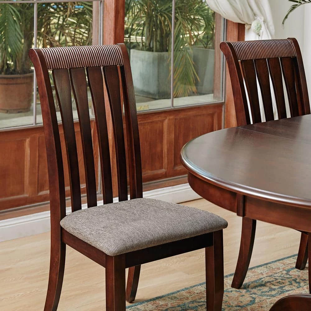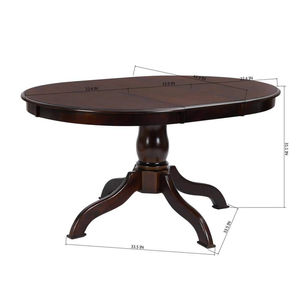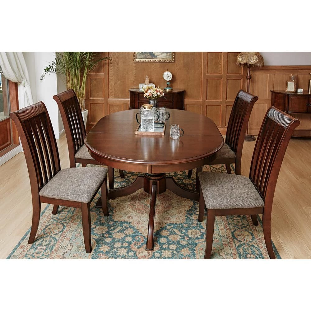 Create a cohesive look in your dining room or seating arrangement with this 5-piece extendable dining set – which includes one table with leaf and four chairs. Built atop a pedestal base, the solid wood table showcases an oval-shaped silhouette and boasts a walnut finish that highlights its natural wood grain color. Each chair features a slat back design and tapered legs that add a classic look and feel to this set.