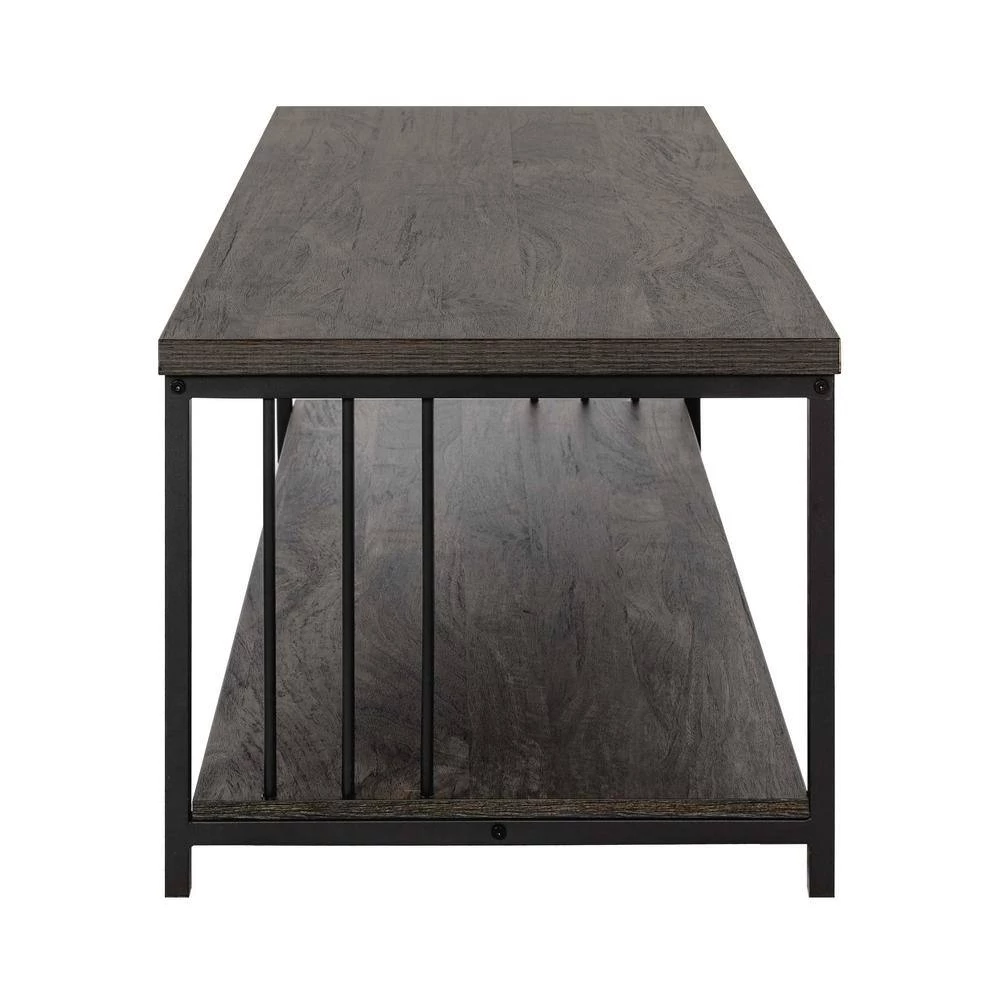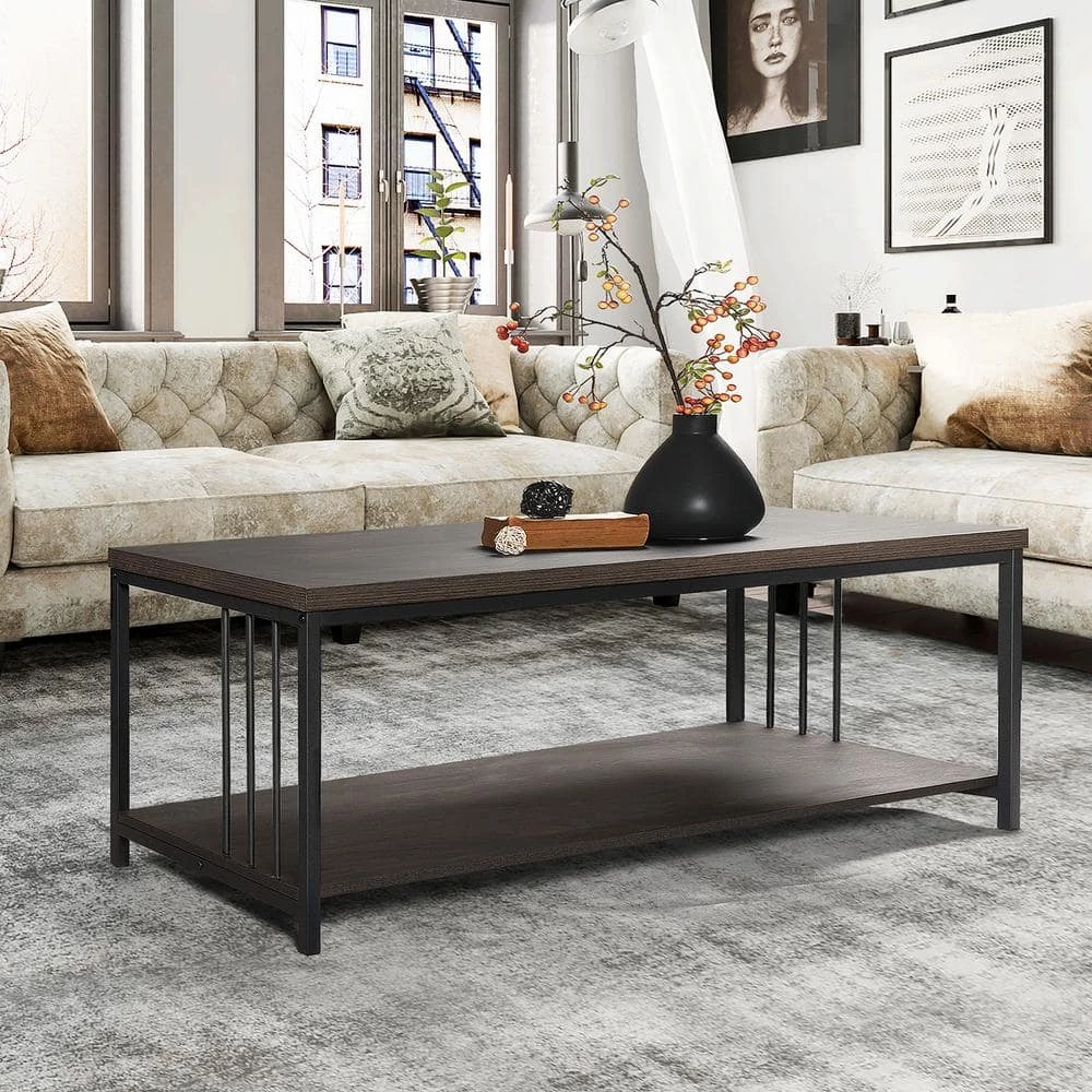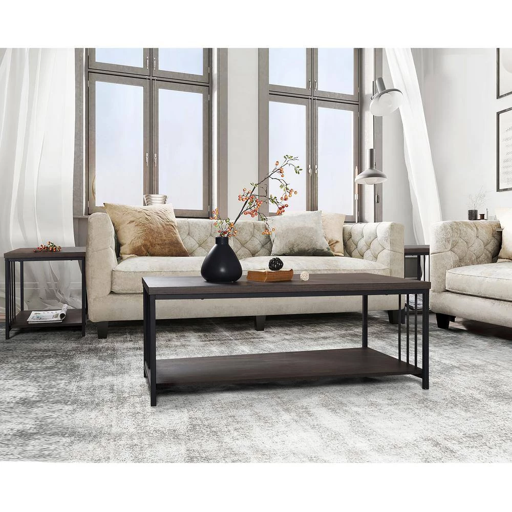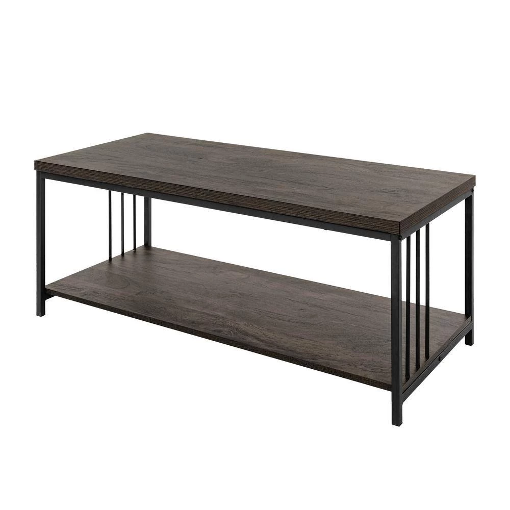 Contemporary design with industrial-inspired style blends well with any home decor, thanks to its clean-line and warm hue. Crafted from manufactured wood with a smooth veneer finish, as well as frame legs with a powder-coated matte black finish. The bottom shelf creates ample open storage to easily organize anything scattered. This coffee table can be used in the living room, bedroom, home office, and more.